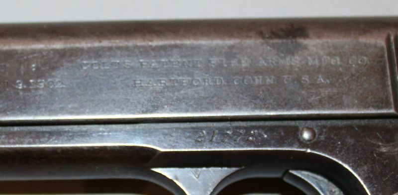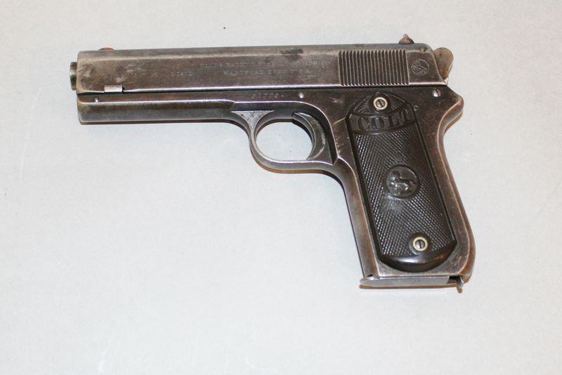 Automatic Colt pistol caliber .38 rimless smokeless, serial no. 21772, patent date of 1902. Has one magazine. All lots are subject to all applicable laws at the time of transfer. NOTE: Semi automatic rifles and all handguns require a license in NYS. There is a $25 transfer fee per long gun. There is a $35 transfer fee per hand gun. The fee is only $20 if you fail the background check. If you fail, you are still required to make payment and then reconsign the gun to auction. FFL dealers are not exempt from these fees.