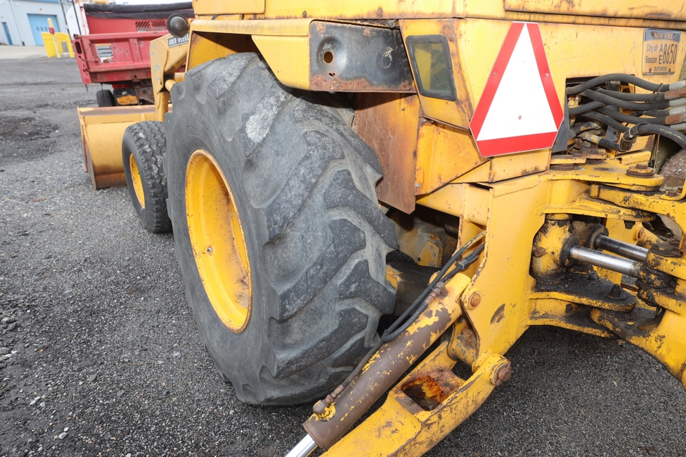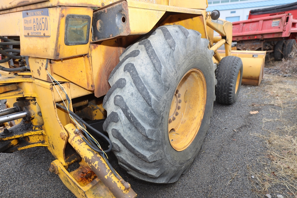 Items include 1980 John Deere 500C Backhoe, 1990 International 4900 sewer jet truck 4X2, 2007 GMC Sierra 3500 dump truck, Mohawk truck tire high rise wheel dolly, and Mi-T-M hot water pressure washer. Items are located in Beacon, NY.