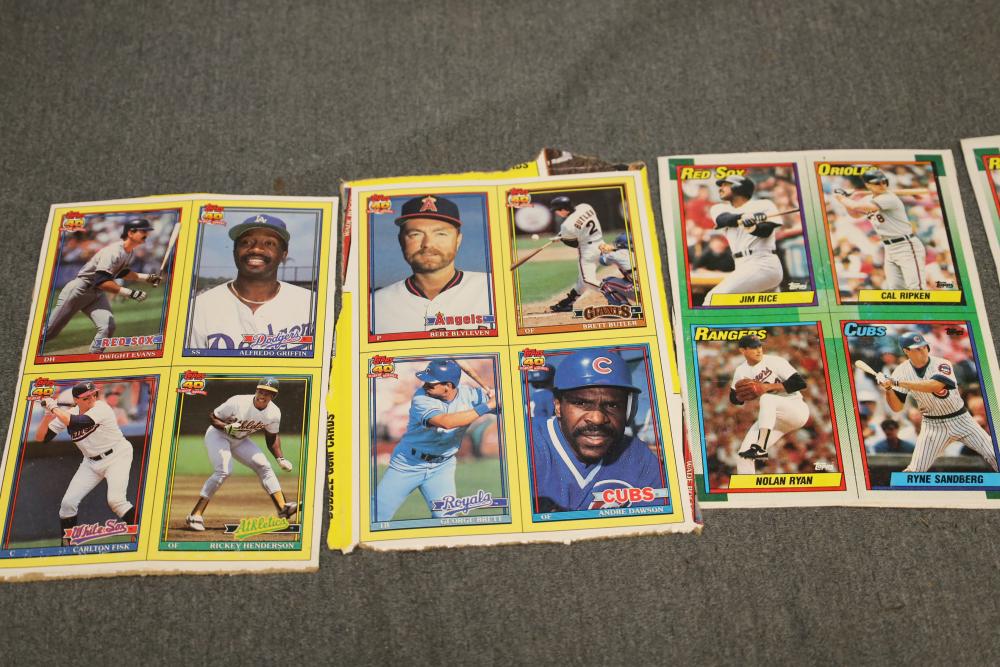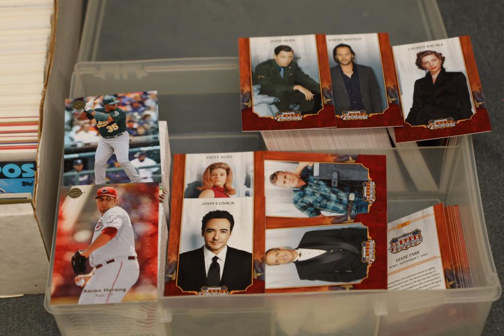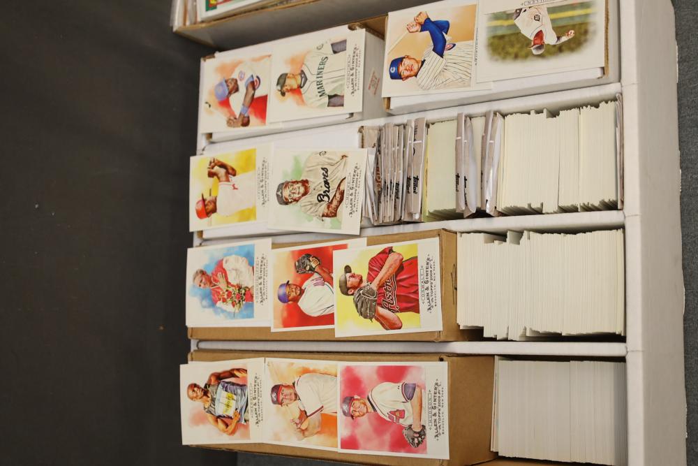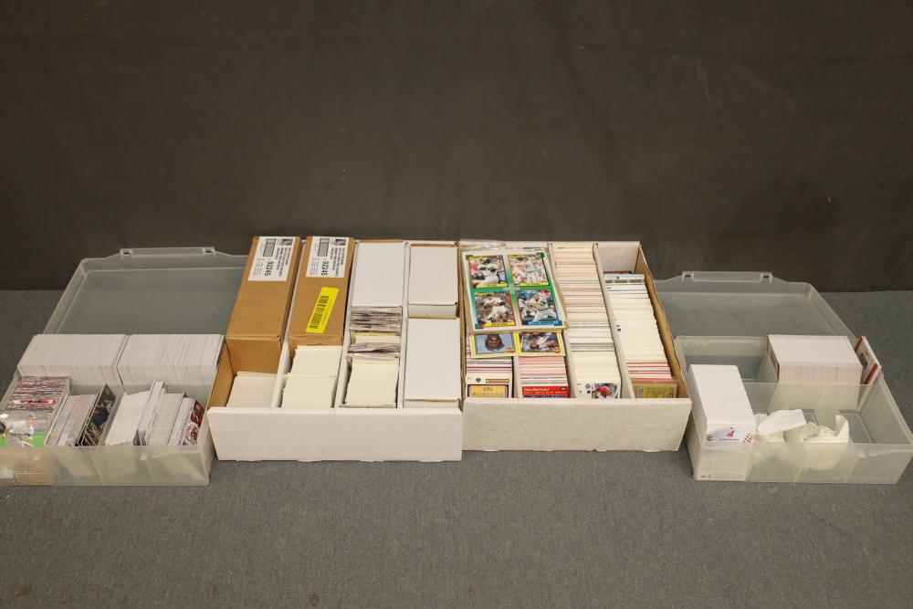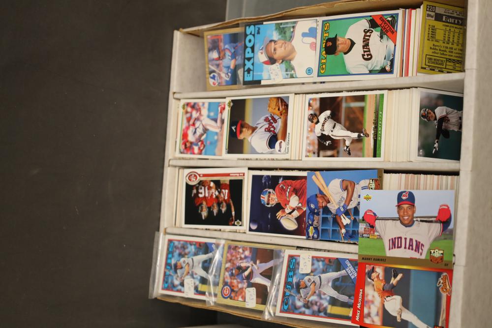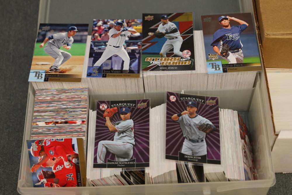 Four boxes of sports cards including Donruss, Topps, Upper Deck, etc. some athletes include Chipper Jones, Phil Hughes, Alex Rodriguez.