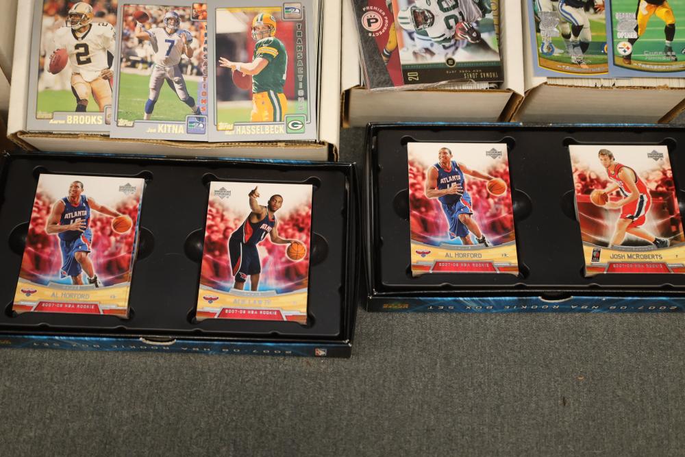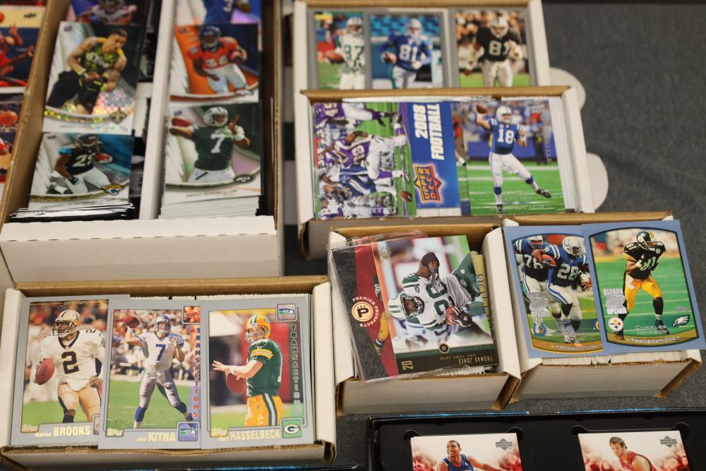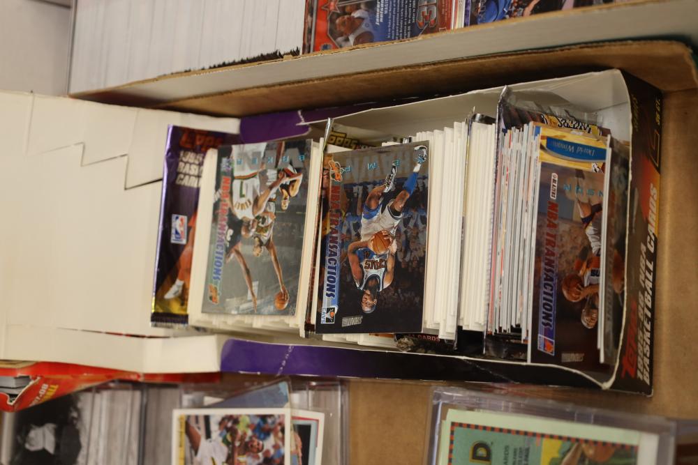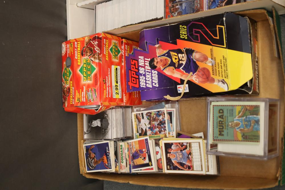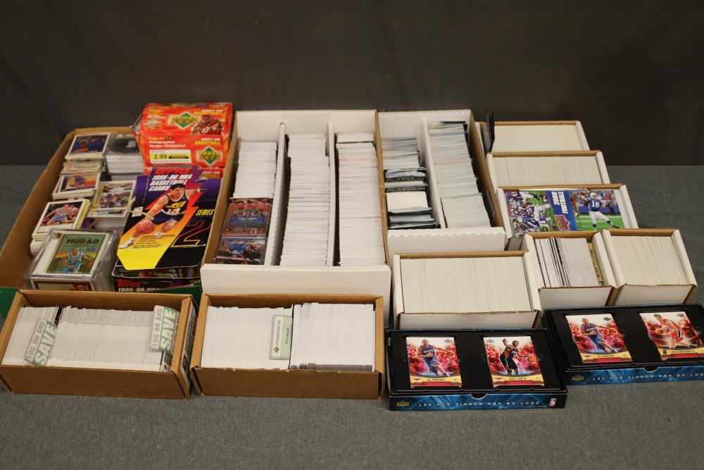 Over eight boxes of sports cards including Topps, Upper Deck, NBA hoops etc., some athletes include Peyton Manning, Larry Hughes, Aaron Brooks , etc.