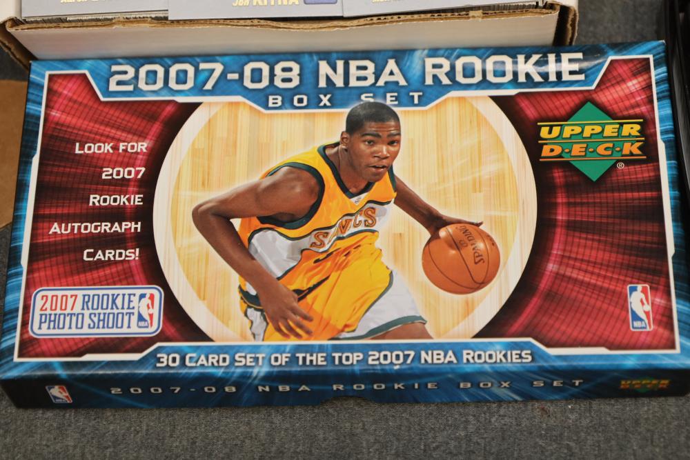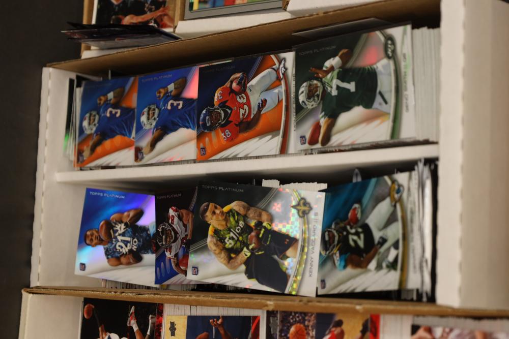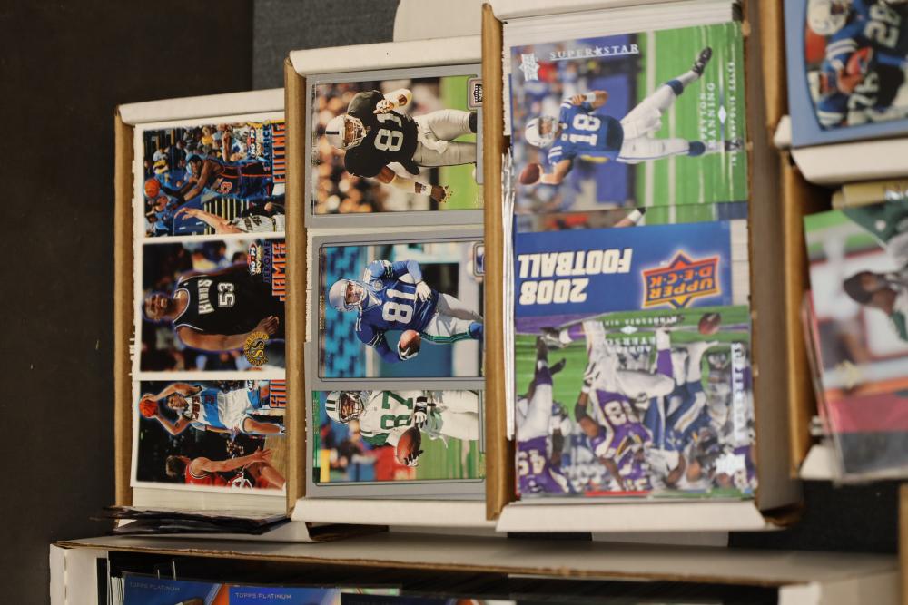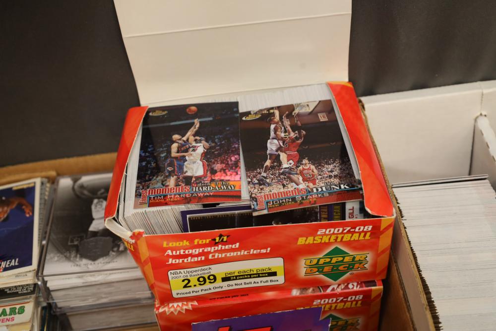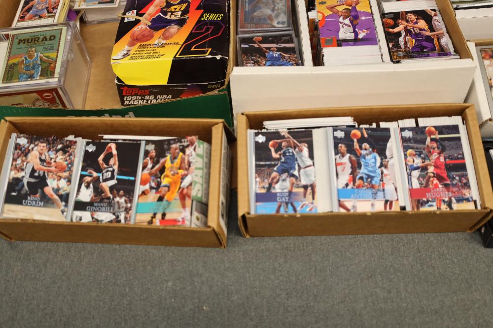 Over eight boxes of sports cards including Topps, Upper Deck, NBA hoops etc., some athletes include Peyton Manning, Larry Hughes, Aaron Brooks , etc.