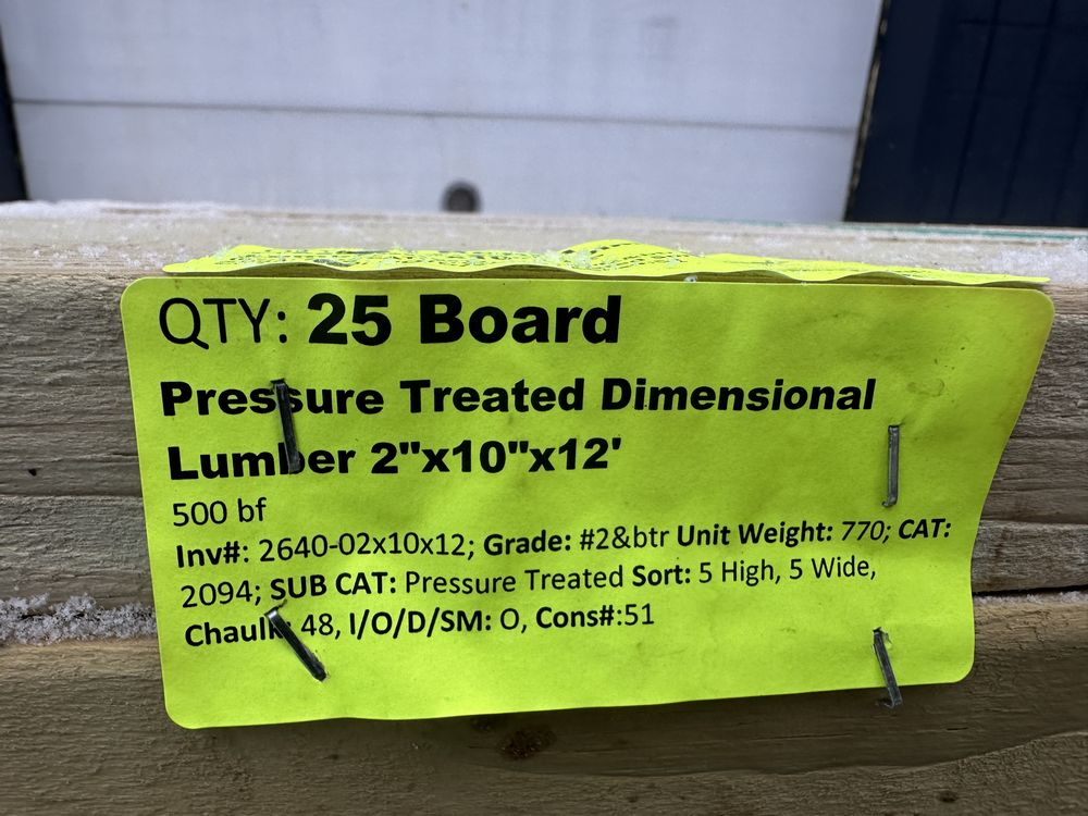 Pressure Treated Dimensional Lumber 2"x10"x12'. 500 Board Foot, Grade: #2&btr. Weight: 770. Sold by: Board. Sold as: Price X Quantity. Inventory #: 2640-02x10x12