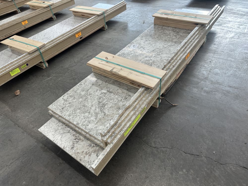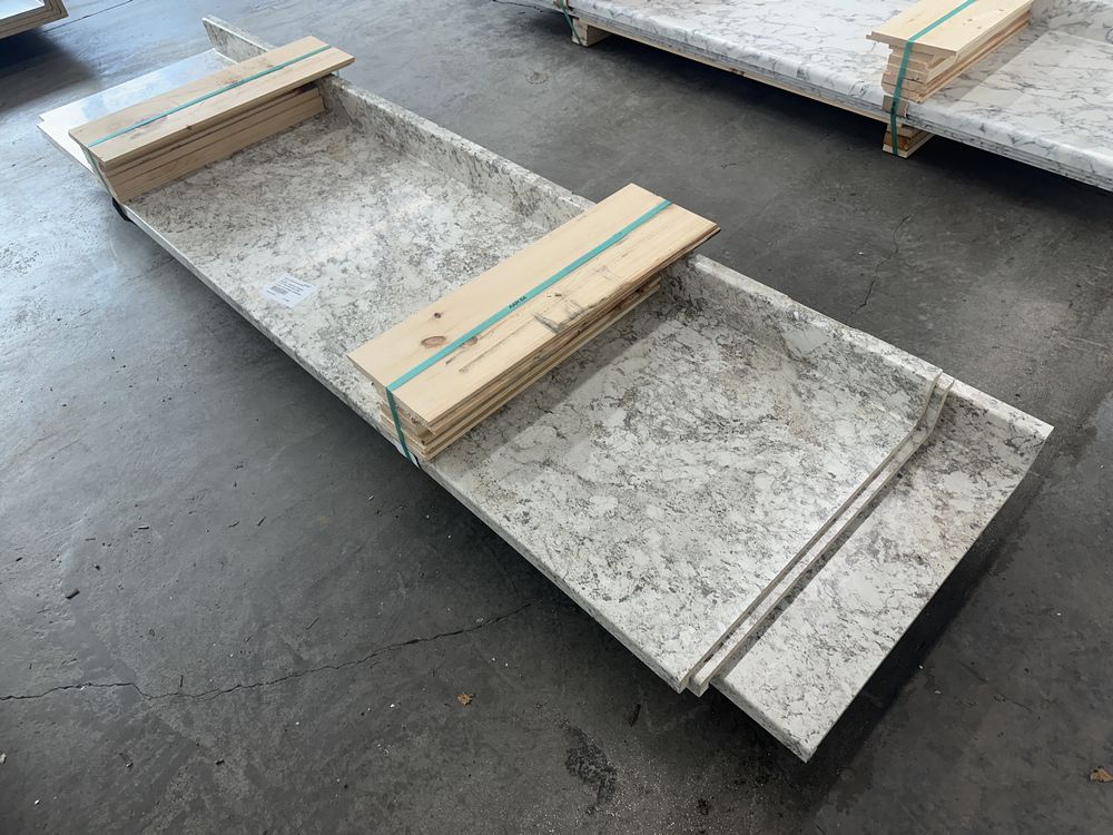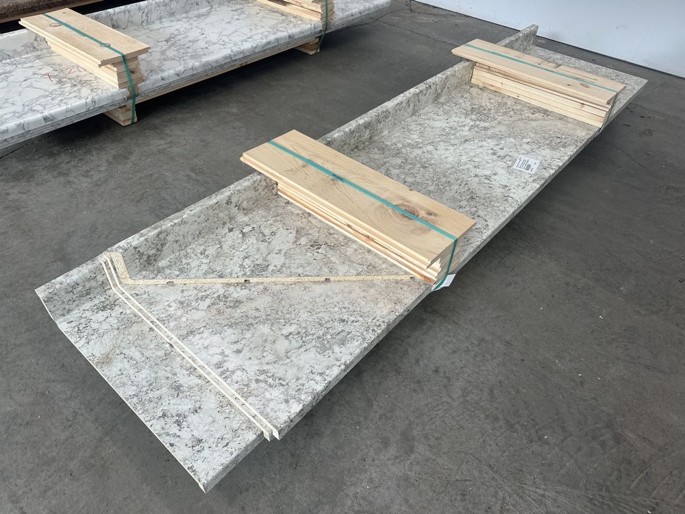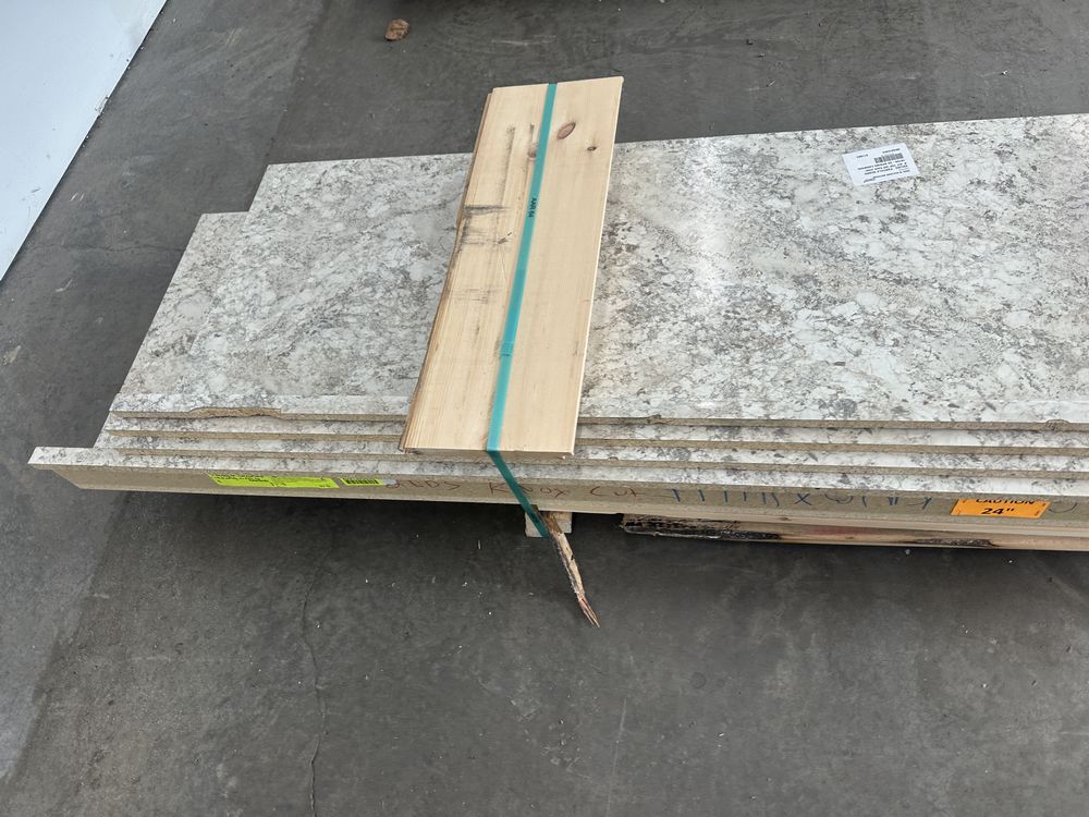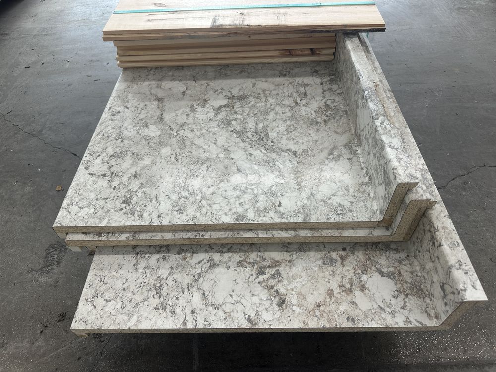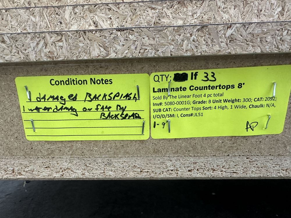Laminate Countertops 8'. Sold By The Linear Foot, 4pc Total, Grade: B *1 Damaged Backsplash, 1 Damaged by water on face, Please See Photos*. Weight: 300. Sold by: Linear Foot. Sold as: Price X Quantity. Inventory #: 5080-0001G