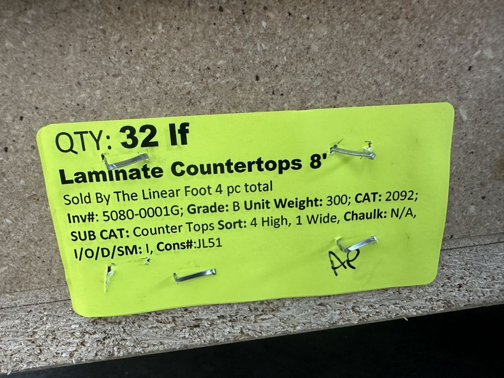 Laminate Countertops 8'. Sold By The Linear Foot, 4pc Total, Grade: B . Weight: 300. Sold by: Linear Foot. Sold as: Price X Quantity. Inventory #: 5080-0001G