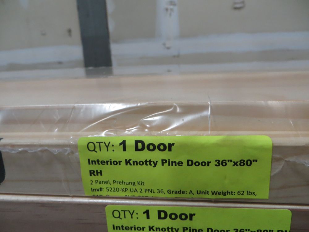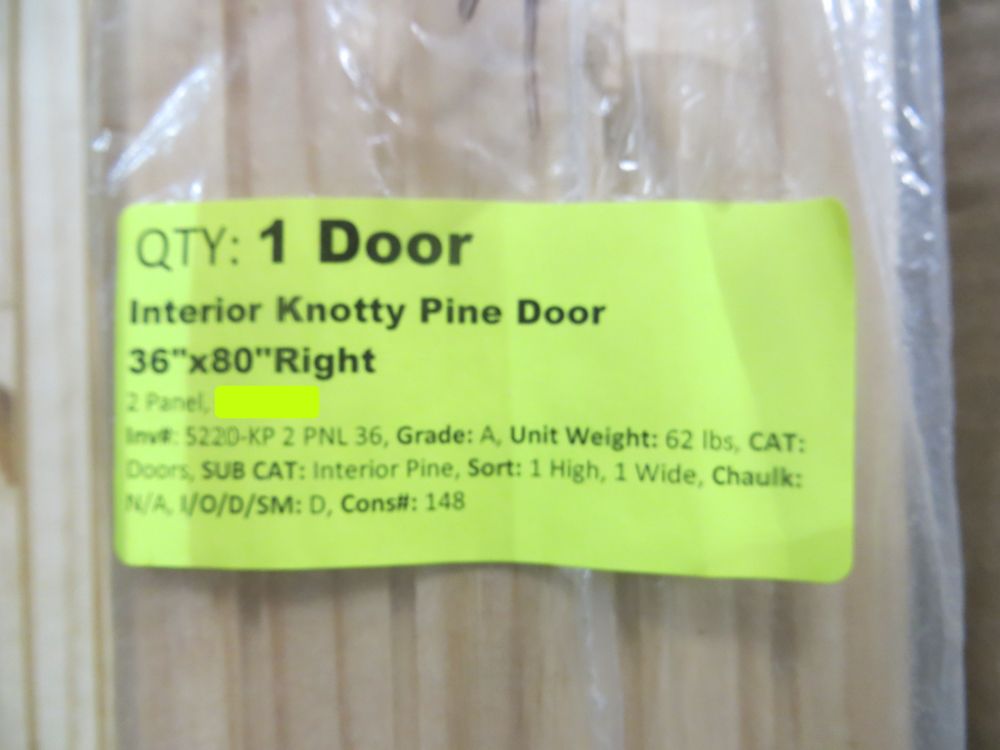 Interior Knotty Pine Door 36"x80" 2 PNL RH (Unassembled). 2 PNL 36" RH Grade A. Weight: x. Sold by: Door. Sold as: Price X Quantity. Inventory #: 5220-KP UA 2 PNL 36 RH