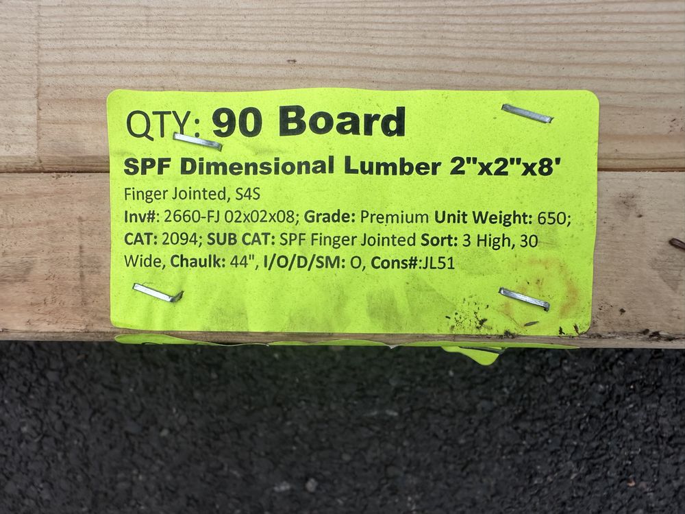 SPF Dimensional Lumber 2"x2"x8'. Finger Jointed, S4S, 240 Board Foot, Grade: Premium. Weight: 650. Sold by: Board. Sold as: Price X Quantity. Inventory #: 2660-FJ 02x02x08