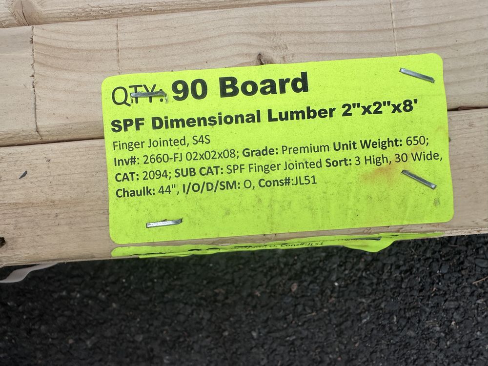 SPF Dimensional Lumber 2"x2"x8'. Finger Jointed, S4S, 240 Board Foot, Grade: Premium. Weight: 650. Sold by: Board. Sold as: Price X Quantity. Inventory #: 2660-FJ 02x02x08