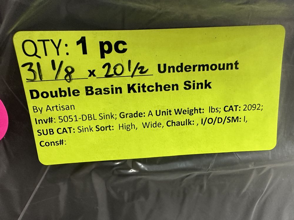 Undermount Double Bowl Kitchen Sink 31 1/8"x20 1/2". By Artisan, Grade: A. Weight: 16. Sold by: Piece. Sold as: Price X Quantity. Inventory #: 5051-DBL Sink