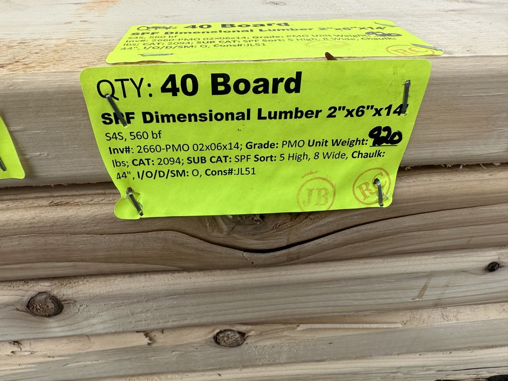 SPF Dimensional Lumber 2"x6"x14' **SEE DESCRIPTION**. S4S, 560 Board Foot, Grade: PMO **Heavy Splits/Cracks, SEE PHOTOS**. Weight: 920. Sold by: Board. Sold as: Price X Quantity. Inventory #: 2660-PMO 02x06x14