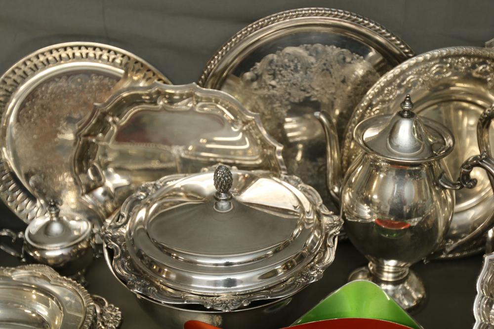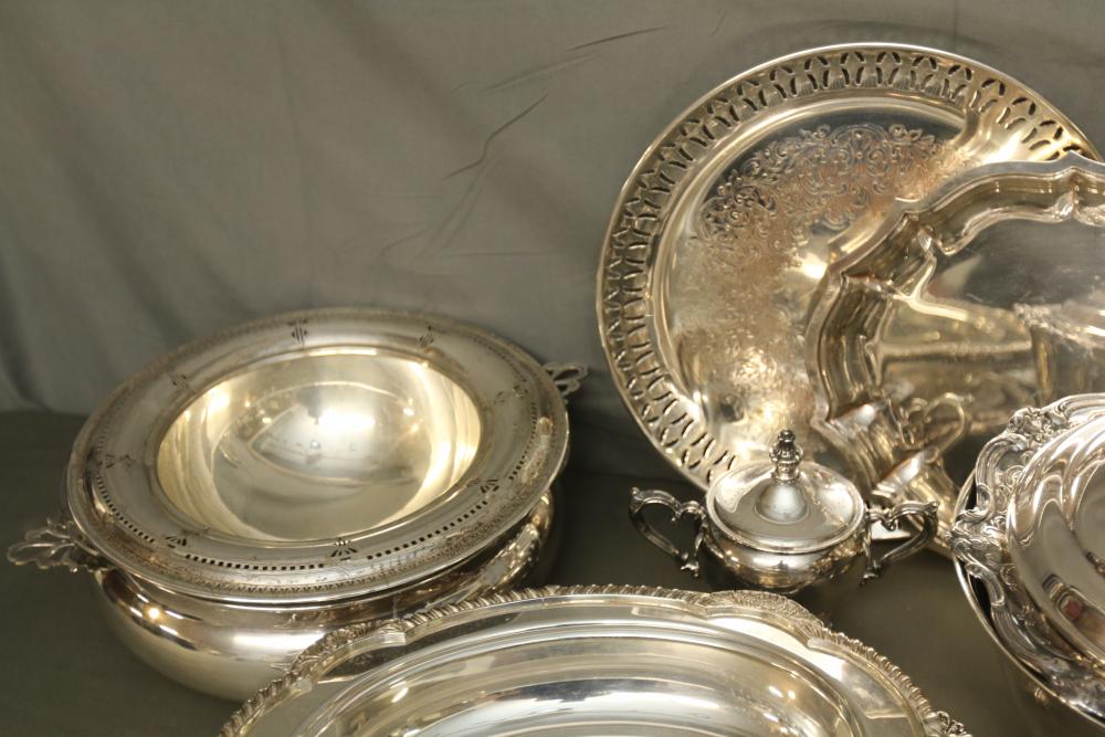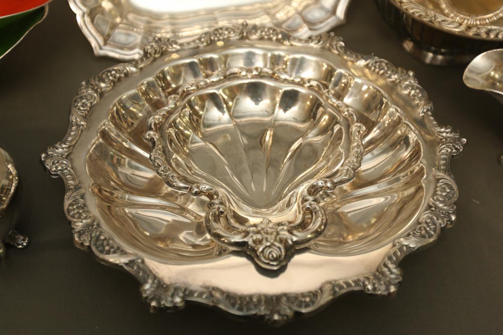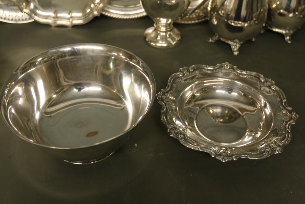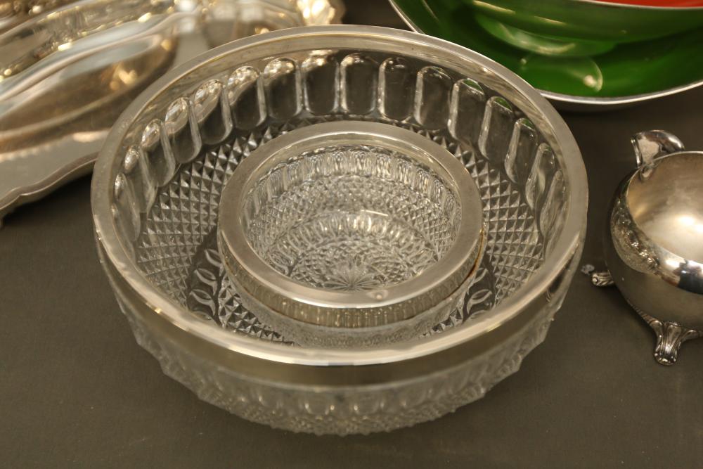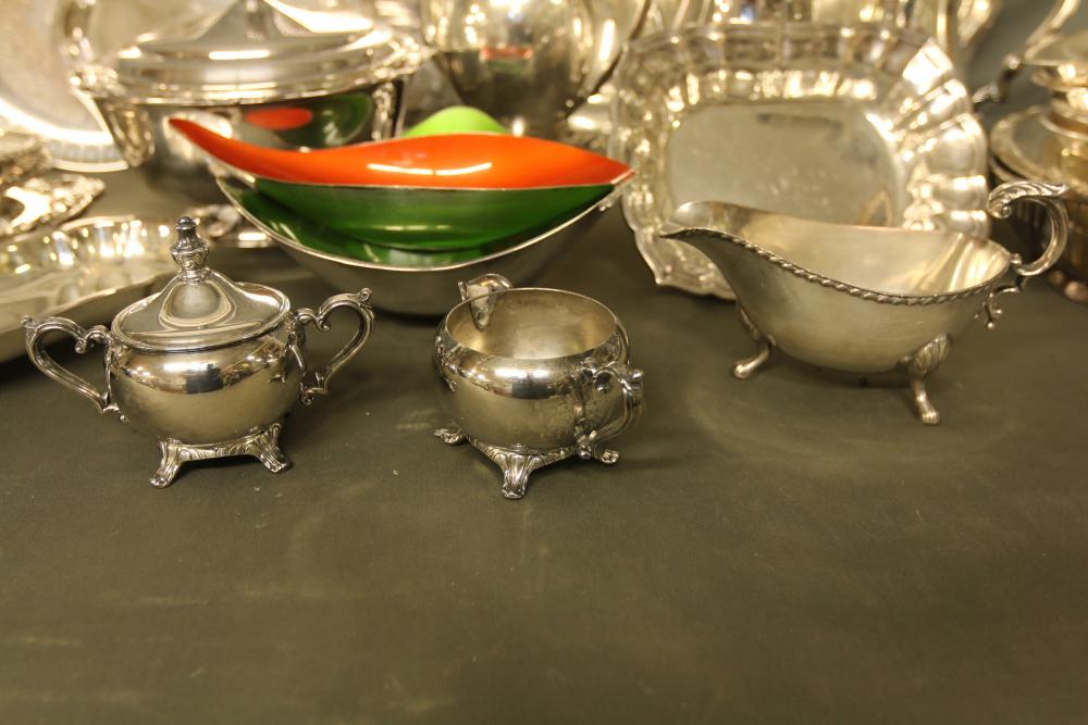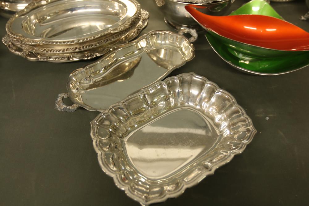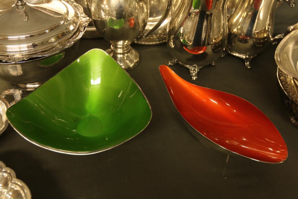 Silver-plated serving items, including trays, bowls, oval dishes, pitchers, and more. Some pieces are stamped with marks such as 'Remembrance,' 'Paul Revere,' or other hallmarks. The set also includes two colorful mid-century modern-style bowls, with one green and one red enamel finish. The collection consists of elaborately designed and plain pieces, showcasing both classic motifs and contemporary aesthetics.
