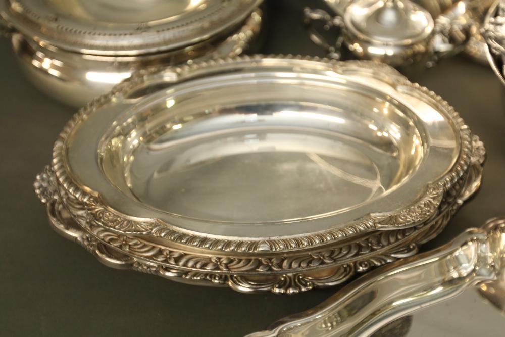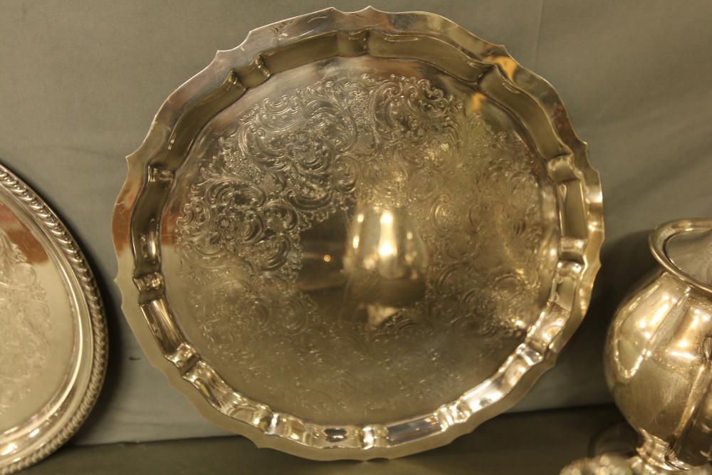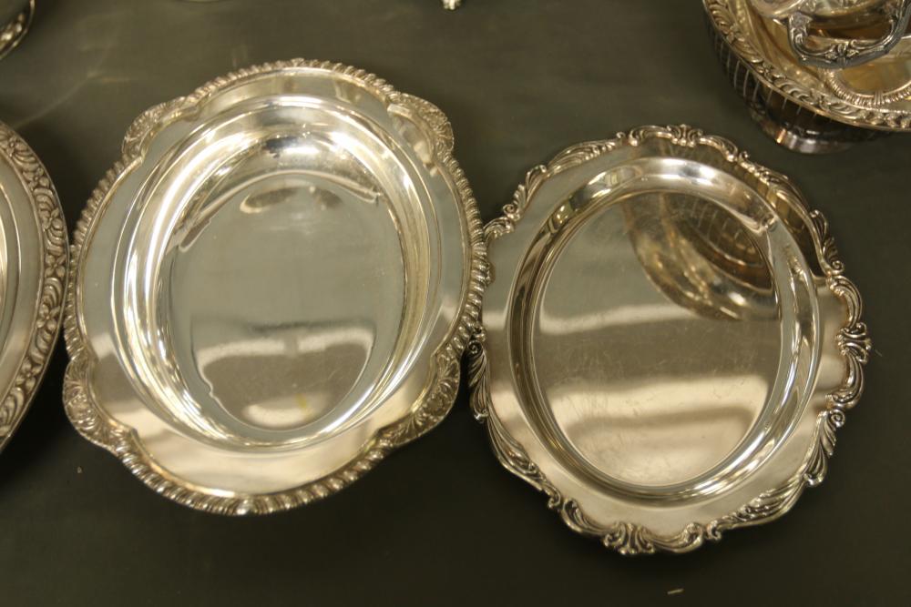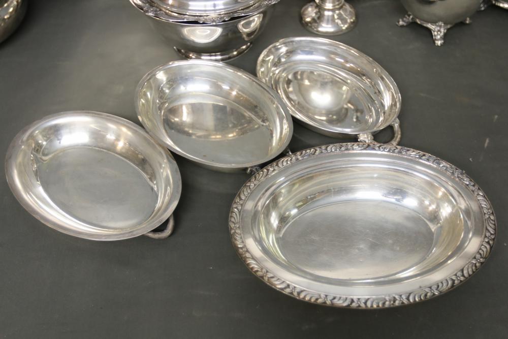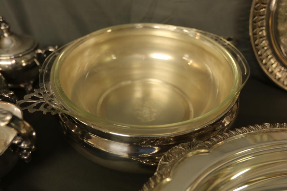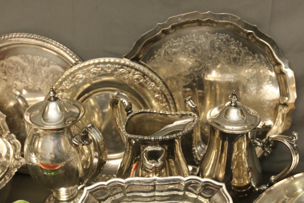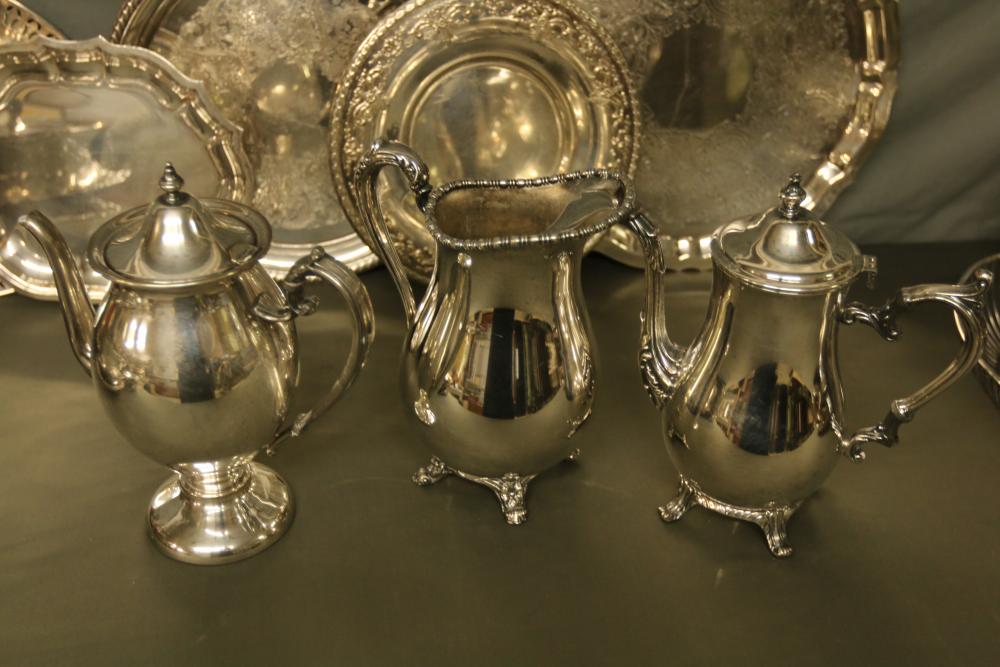Silver-plated serving items, including trays, bowls, oval dishes, pitchers, and more. Some pieces are stamped with marks such as 'Remembrance,' 'Paul Revere,' or other hallmarks. The set also includes two colorful mid-century modern-style bowls, with one green and one red enamel finish. The collection consists of elaborately designed and plain pieces, showcasing both classic motifs and contemporary aesthetics.