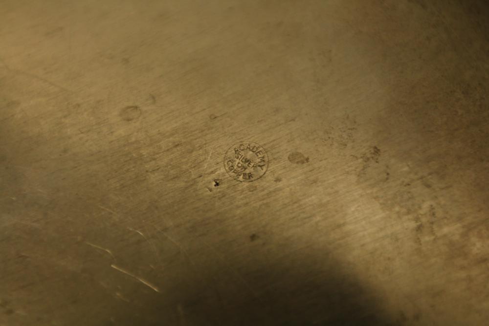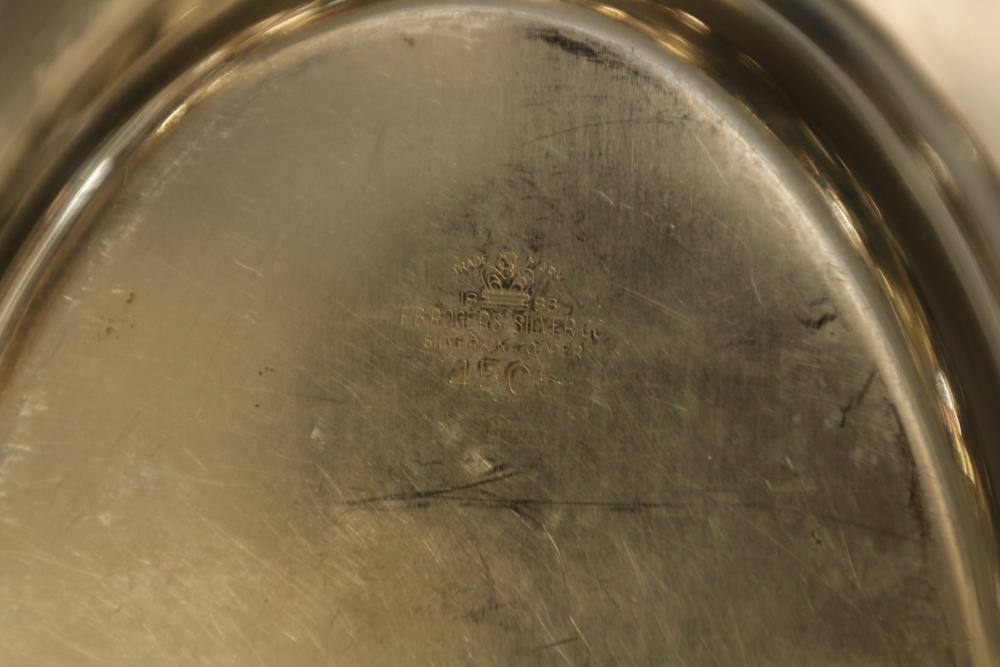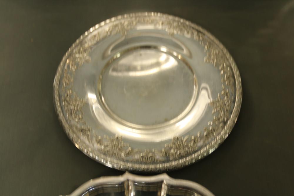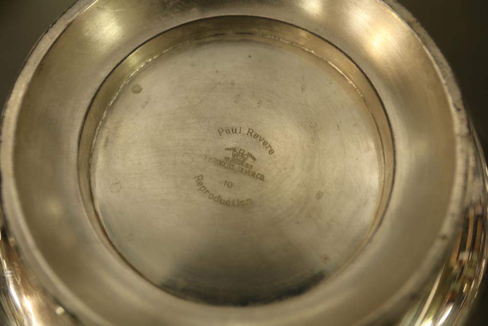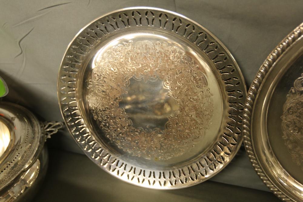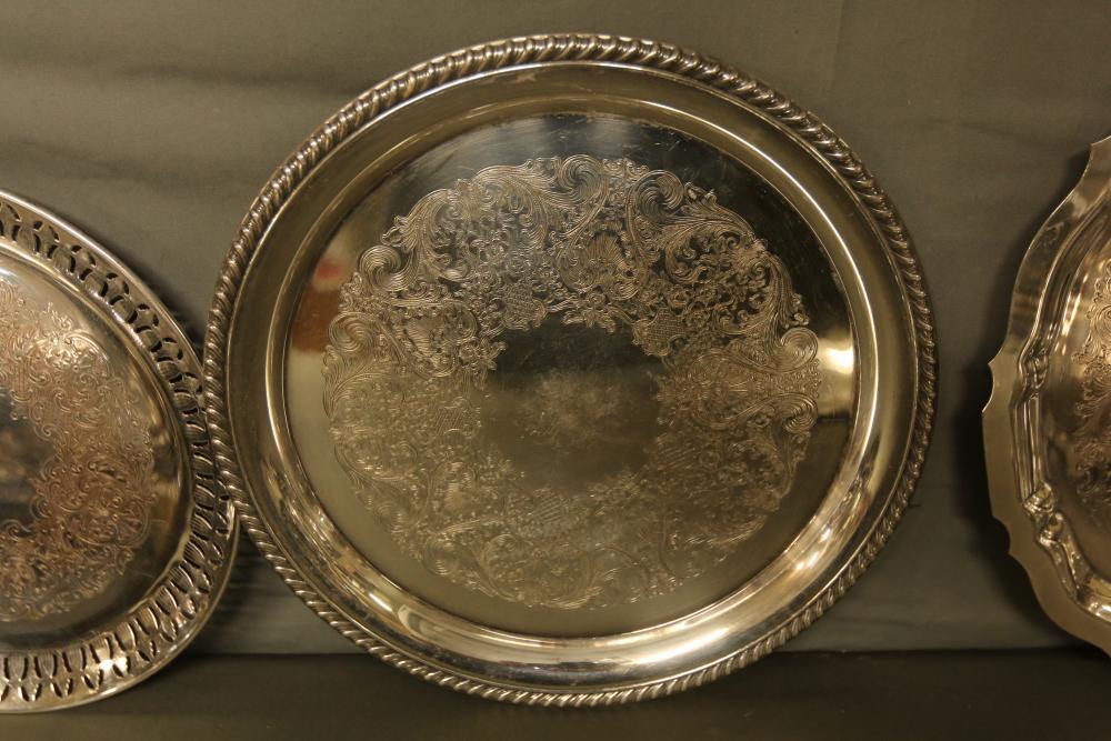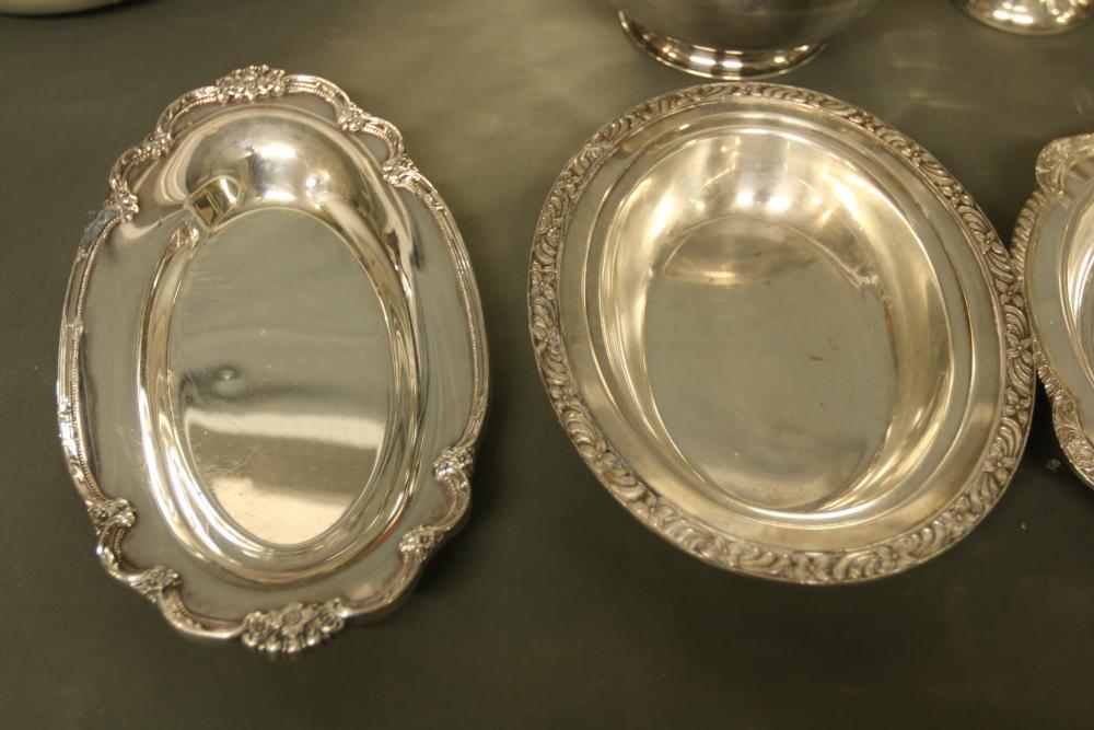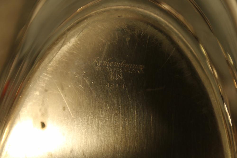 Silver-plated serving items, including trays, bowls, oval dishes, pitchers, and more. Some pieces are stamped with marks such as 'Remembrance,' 'Paul Revere,' or other hallmarks. The set also includes two colorful mid-century modern-style bowls, with one green and one red enamel finish. The collection consists of elaborately designed and plain pieces, showcasing both classic motifs and contemporary aesthetics.