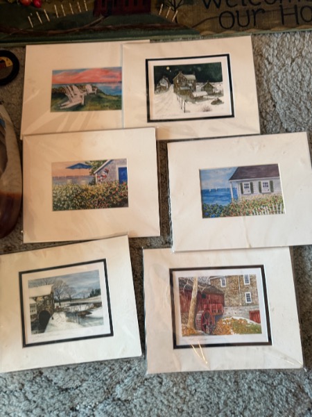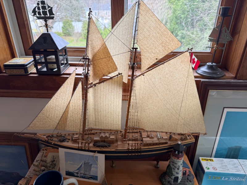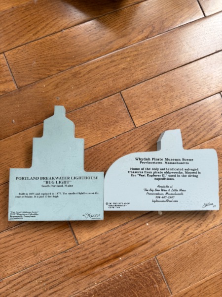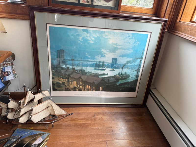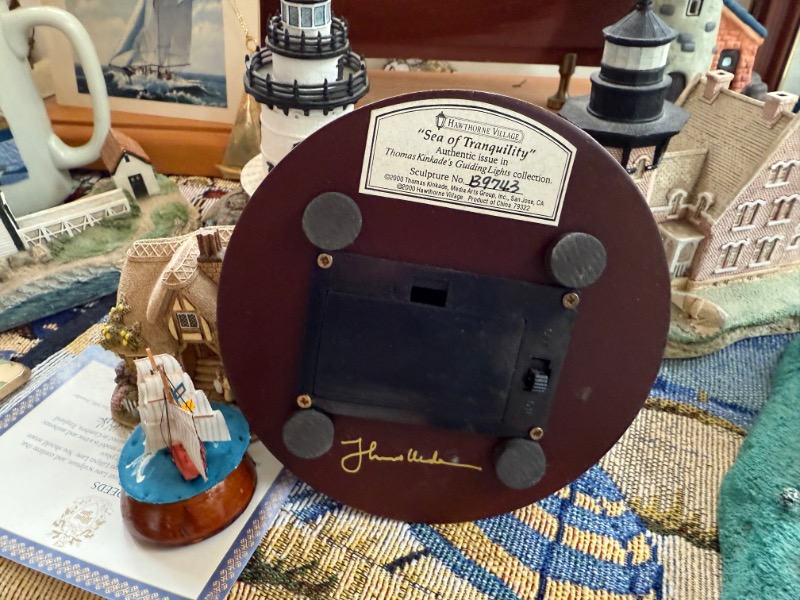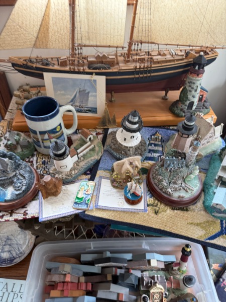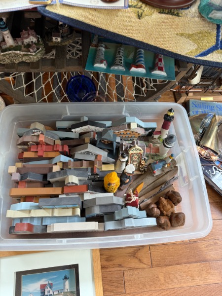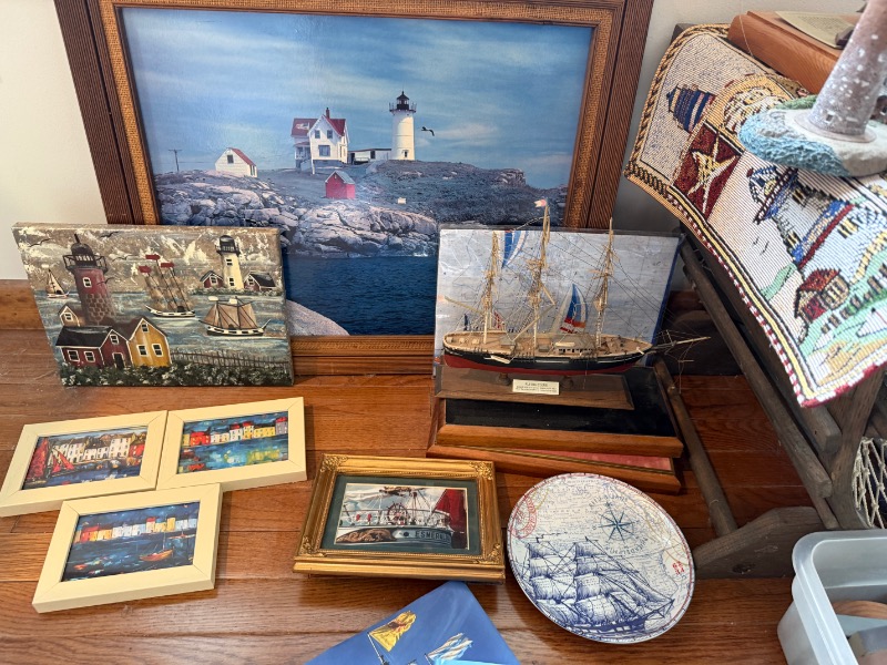 Lobster Trap Style Table, Nautical Decor. Table 25”Wx19”Dx18”H, decor incuding La Sirene model ship, Thomas Kinkade sculptures, approx. two dozen “East Coast Lighthouse Series” & “Cats Meow” accessories, painting of “View from South Street, NY in 1892” by William Gordon Muller, “The Wit & Wisdom of Benjamin Franklin” other items as seen in photos.