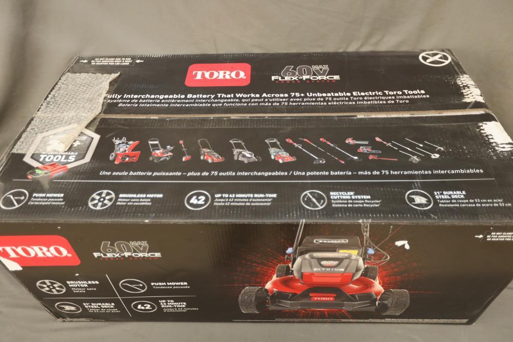 Toro 60V Flex-Force Recycler Push Lawn Mower, model 21323. Features a 21-inch cutting width, brushless motor, and Recycler Cutting System for efficient operation. Runs on a 60-volt lithium-ion battery with up to 42 minutes of runtime. Includes SmartStow technology for vertical storage to save space. Packaged in its original box. Made in Mexico.