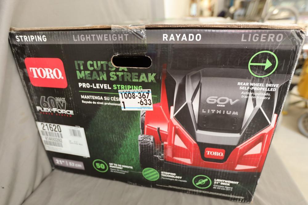 Toro 60V Max Flex-Force Power System self-propelled lawn mower featuring a 21-inch (53 cm) cutting width. Rear-wheel drive for enhanced traction and self-propulsion for easier mowing. Includes a lithium-ion battery with a runtime of up to 50 minutes. Lightweight design with pro-level striping capabilities. Suitable for various terrains and mulching. Box displays signs of wear.