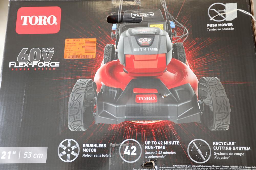 Toro 21-inch 60V MAX Flex-Force Recycler Push Mower, model 21323. Features a brushless motor, up to 42-minute run time, and Recycler Cutting System for efficient mowing. Includes SmartStow capability for storage. Unit is new in box.