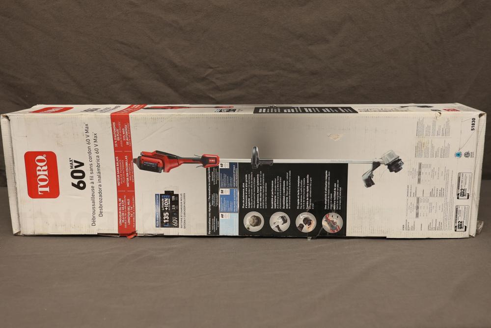 Toro 60V Max cordless string trimmer featuring a 16-inch cutting width and brushless DC motor. Includes L135 60V battery (2.5 Ah, 135 Wh) and charger 88602. Features include adjustable line diameter (0.080-0.095 inches), up to 50 minutes of runtime, variable cutting speed, and ergonomic design for comfort. New in box.