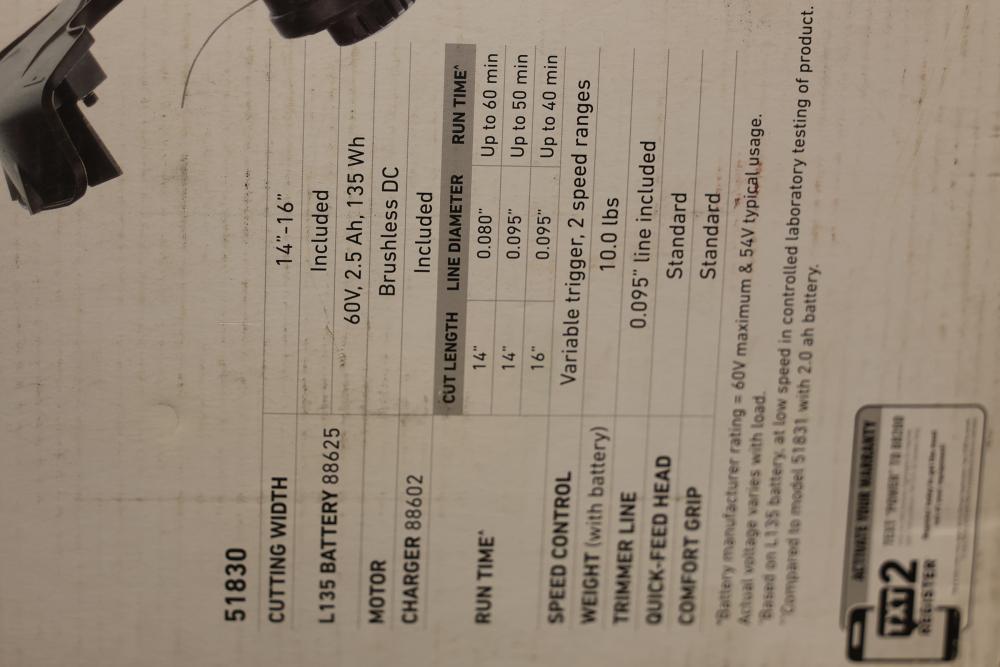 Toro 60V Max Cordless String Trimmer features a 16" cutting width and comes with a brushless DC motor that offers superior durability and performance. Includes an L135 battery (2.5Ah) and charger. Adjustable cutting settings allow customization between 14" and 16" for precise trimming needs. Features a variable speed trigger, ergonomic comfort grip, and easy line replacement capability. Designed for reliable outdoor functionality. New in box.