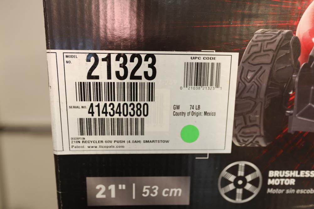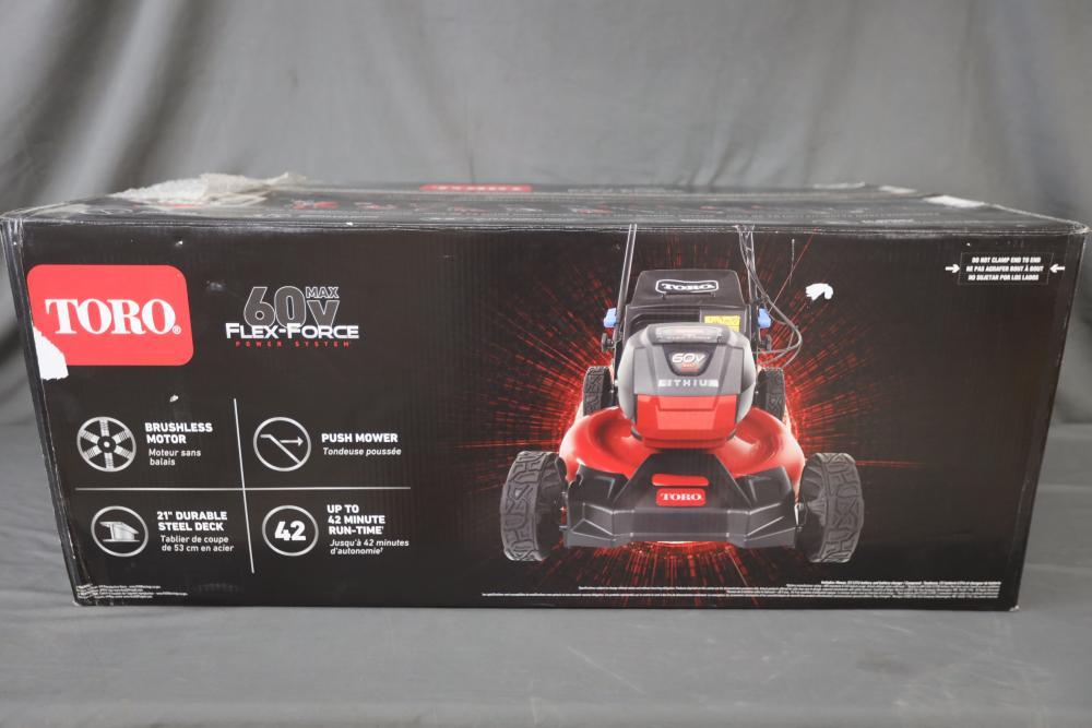Toro 21-inch 60V Max Flex-Force cordless push mower featuring a brushless motor, recycler cutting system, and up to 42 minutes of runtime. Includes a SmartStow feature for compact storage and is compatible with the Flex-Force battery system. New in box.