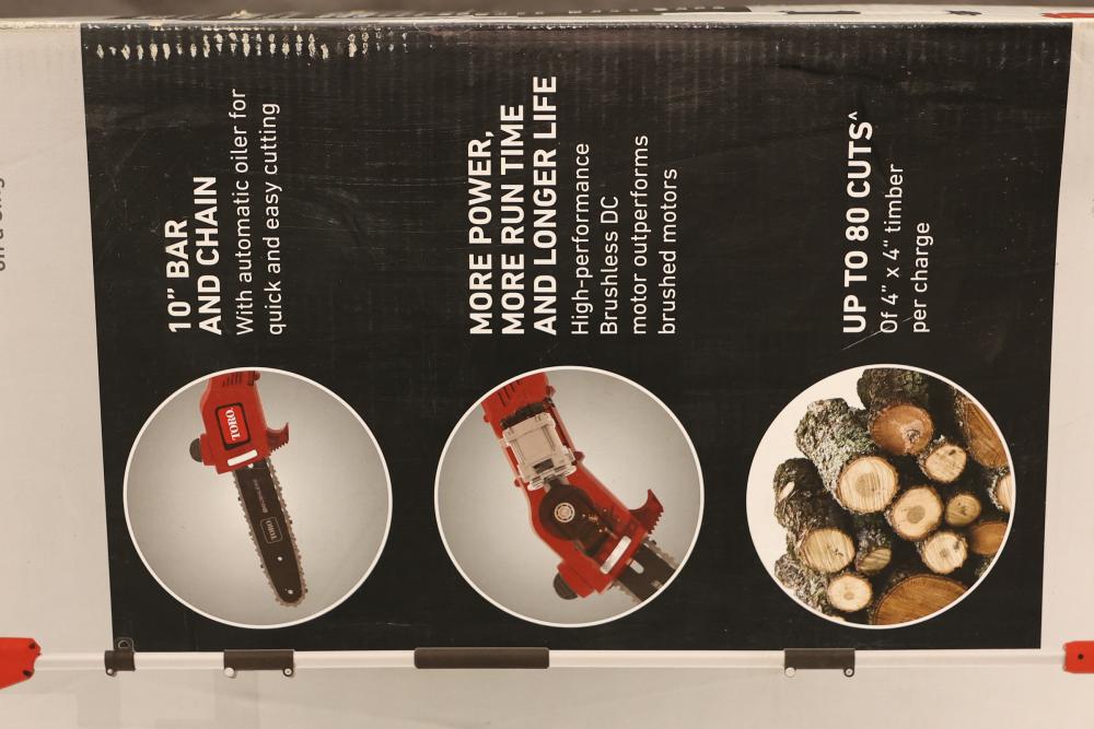 Toro 60V Max cordless pole saw with an 8-foot reach and 10-inch bar and chain. Features a brushless motor for enhanced power and longevity, high-performance motor, onboard oil tank, and ergonomic comfort grip. Includes tool only; works with Toro 60V Flex-Force battery (battery sold separately). Made for quick and easy cutting with up to 80 cuts per charge. New in box.