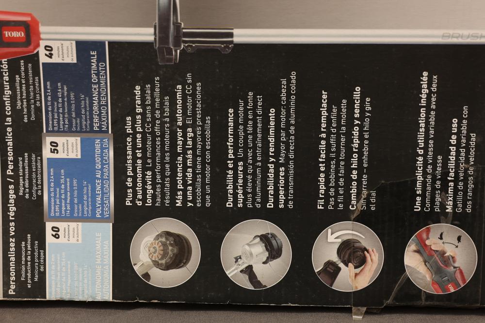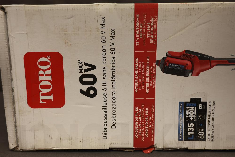 Toro 60V Max cordless string trimmer featuring a brushless DC motor for increased power and durability. Includes the L135 battery and charger. Offers a 16� cutting width with adjustable settings and a variable speed trigger for enhanced control. Comes with a 0.095� trimmer line pre-loaded on the bump feed head. Ergonomic comfort grip and easy line replacement capability are included. New in box.