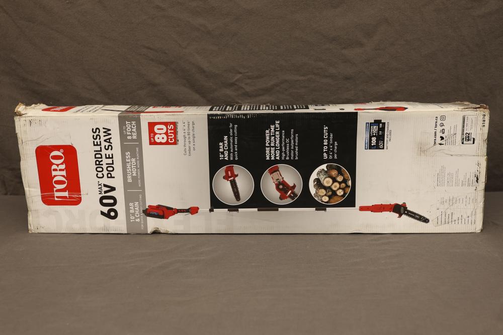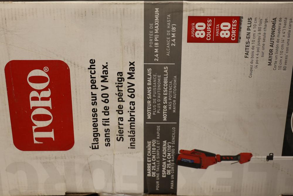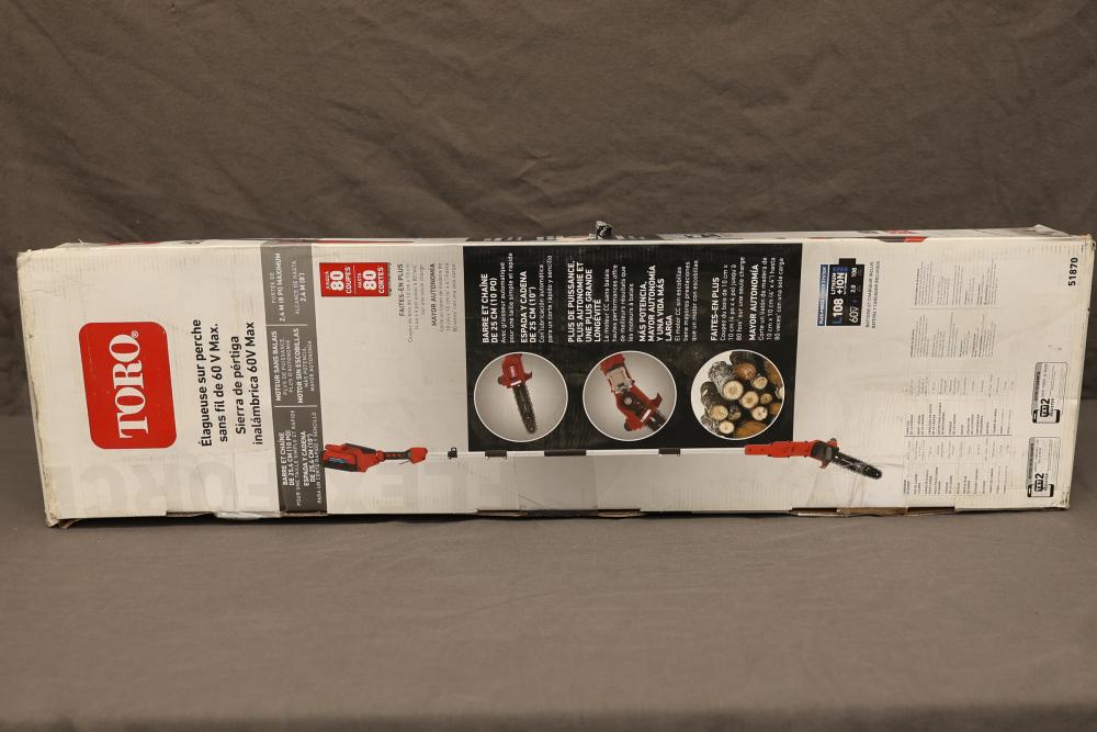 Toro 60V Max cordless pole saw featuring a 10-inch bar and chain with an 80 ml oil reservoir for automatic chain lubrication. Designed with a brushless motor for enhanced power and runtime, it supports up to 80 cuts per charge. The tool comes with ergonomic comfort grip handles and has a standard bar cover included. The battery is a 60V 2.0Ah model with a charging time of 100 minutes. Weight is 12.2 lbs with the battery, and 9.0 lbs without it. New in box.