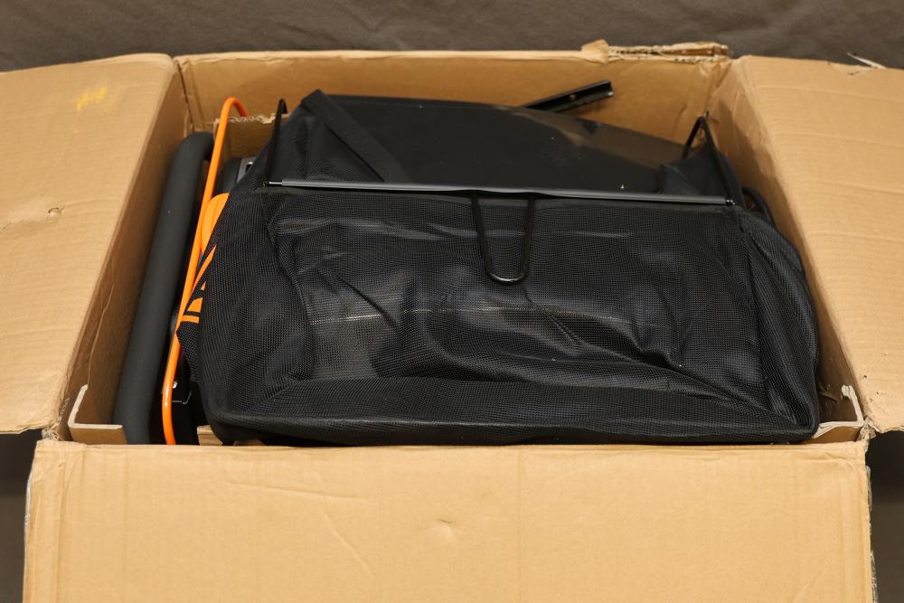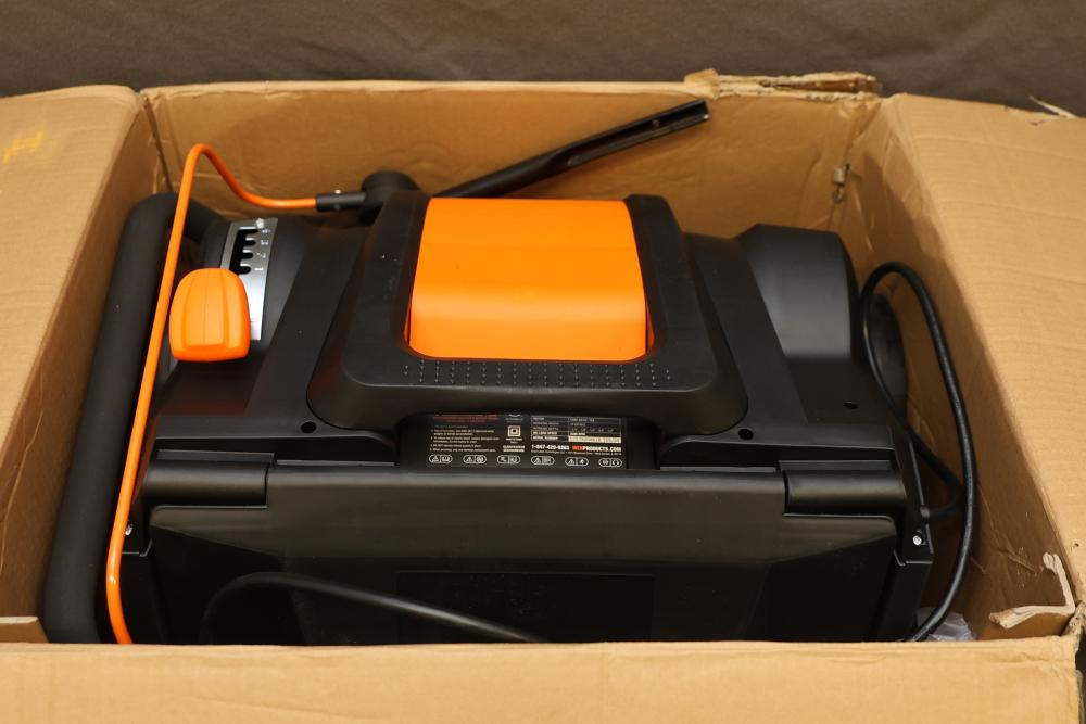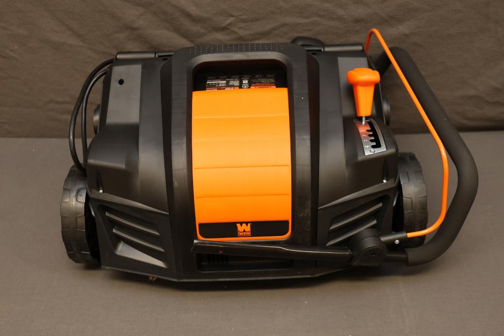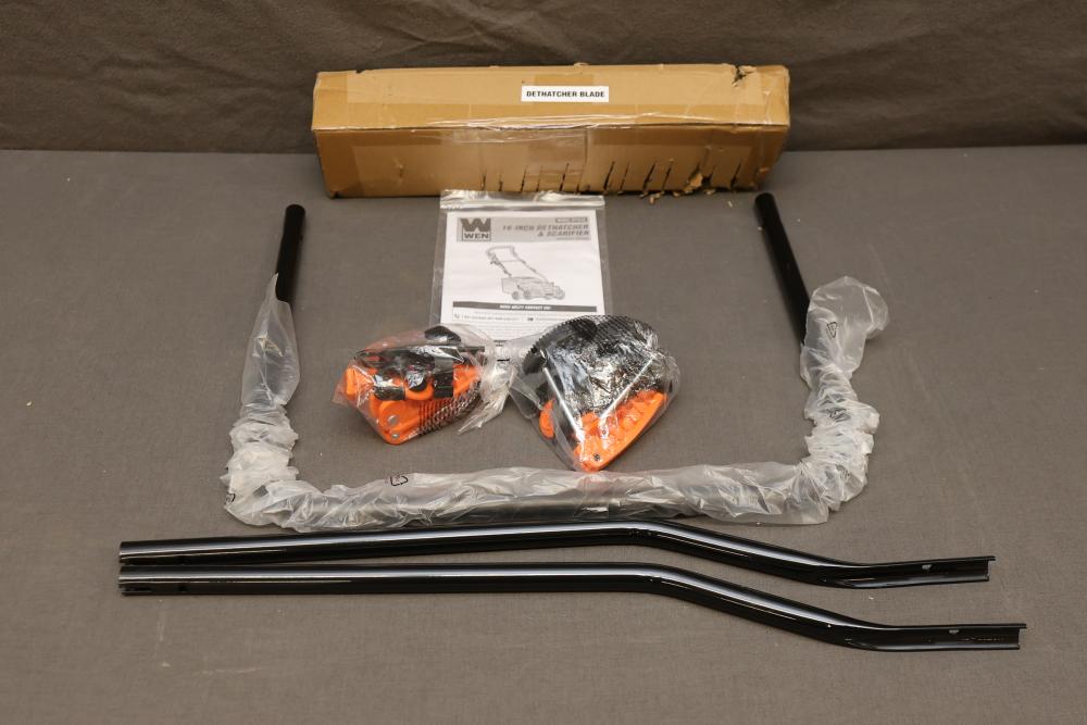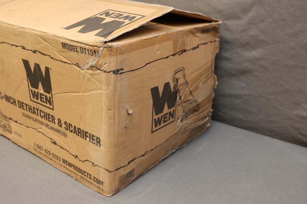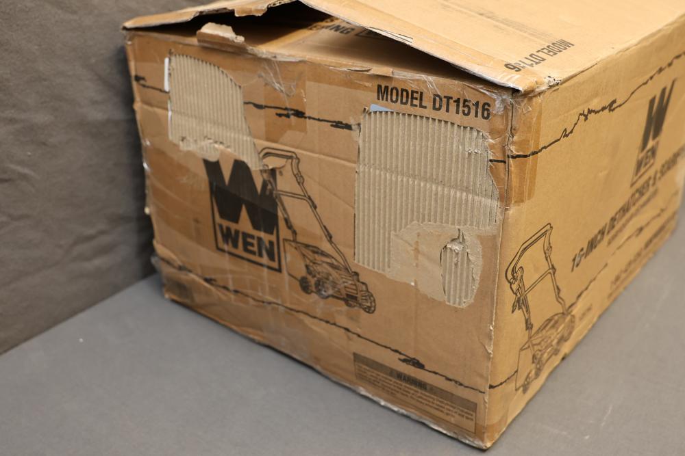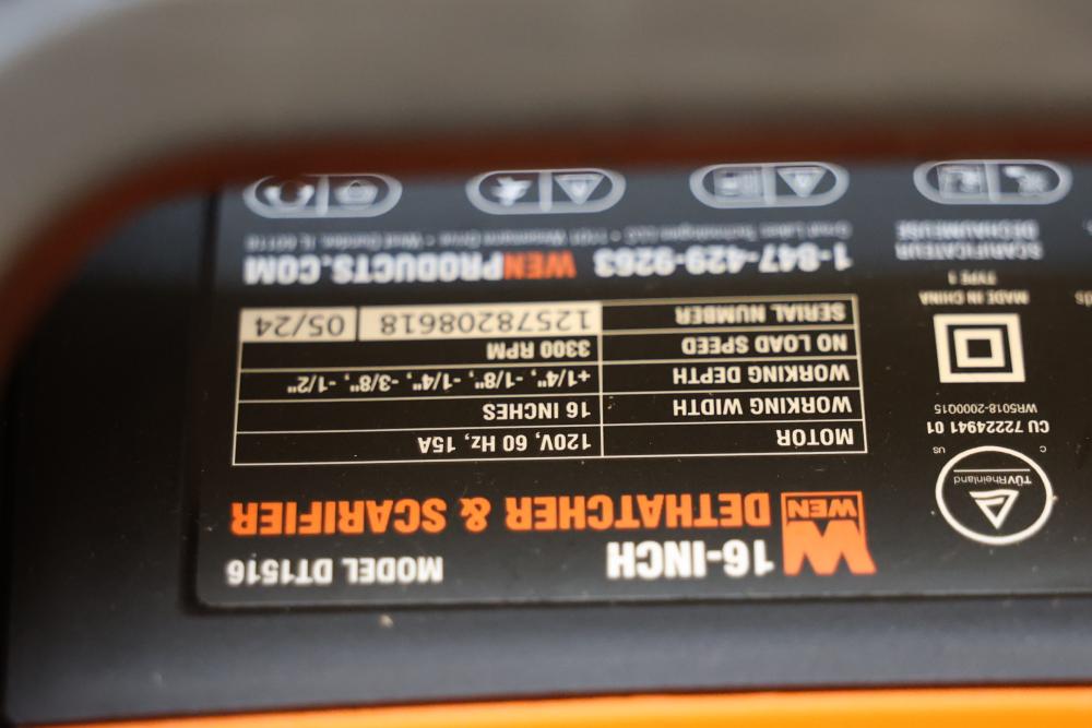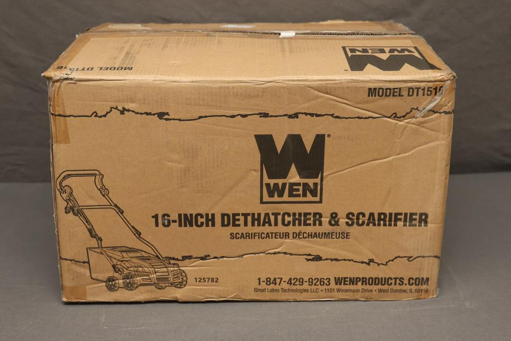 WEN DT1516 16-inch dethatcher and scarifier. Features a 13-amp motor with a working width of 16 inches and 5-position depth adjustment. Comes with original box, assembly parts, and user manual. The box shows signs of wear but contains all necessary components. Runs and operates.