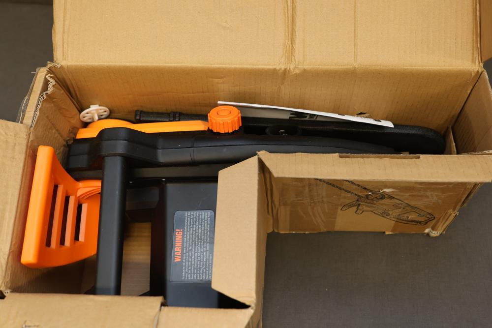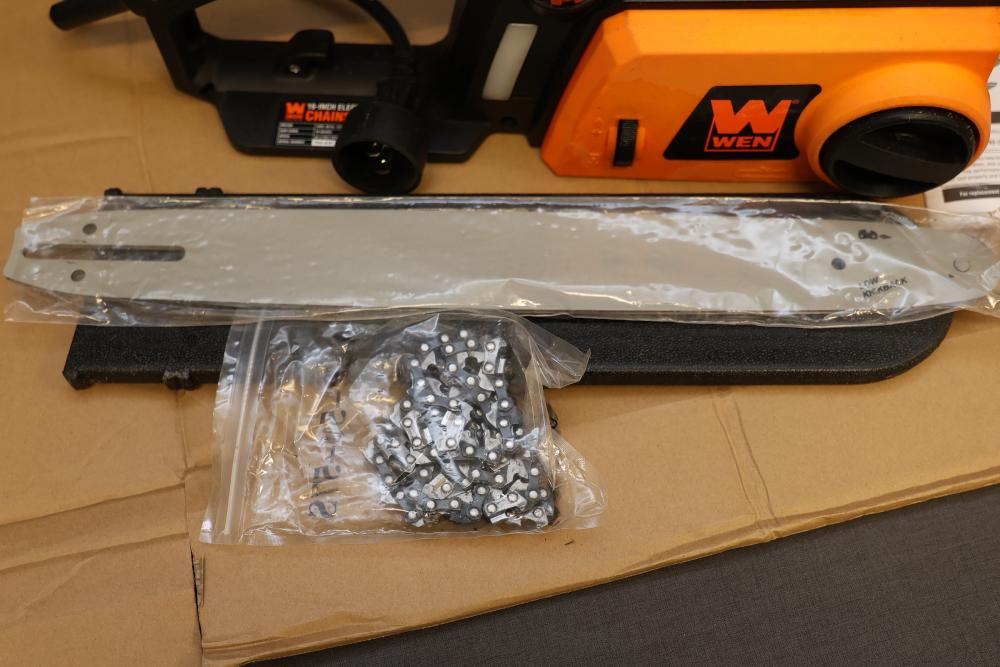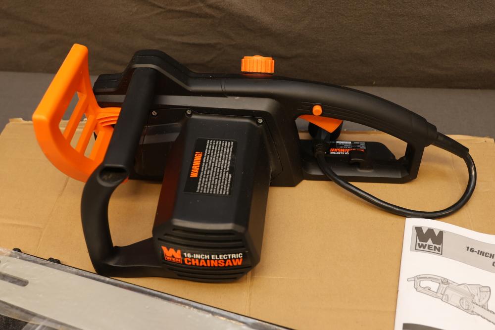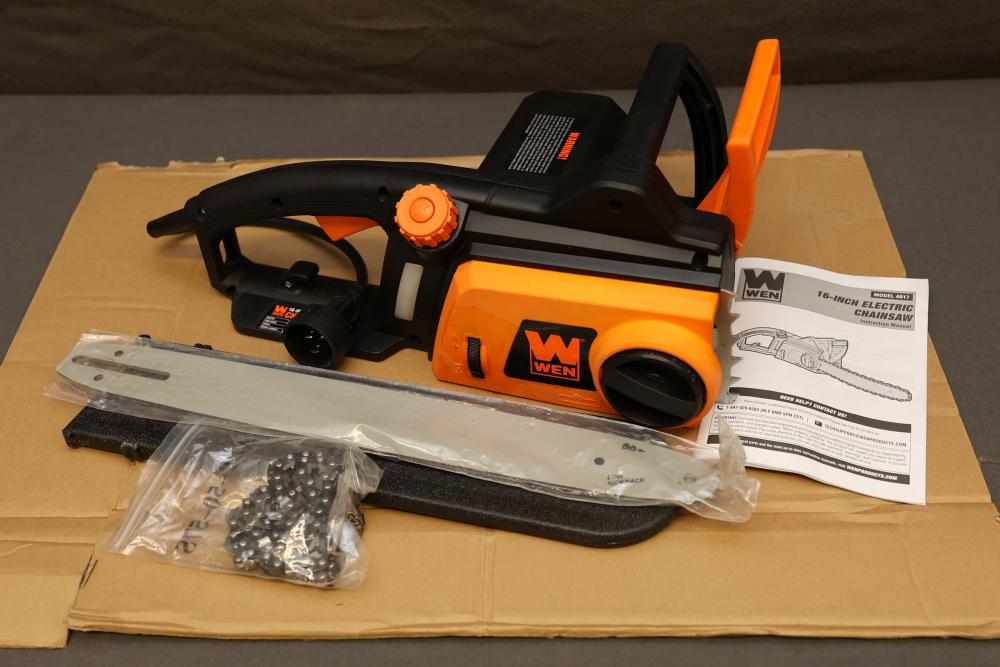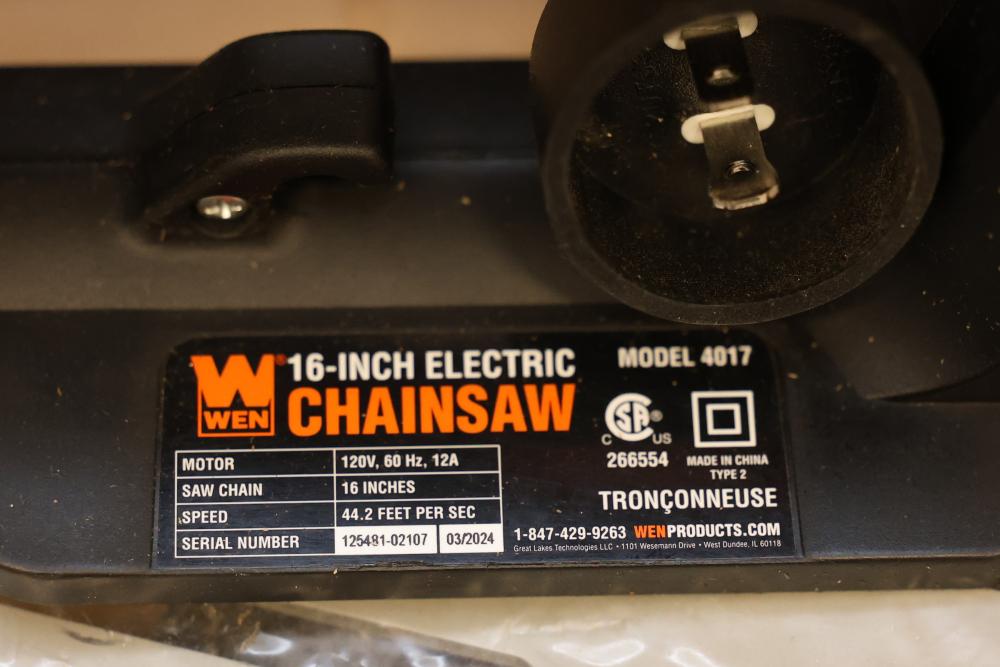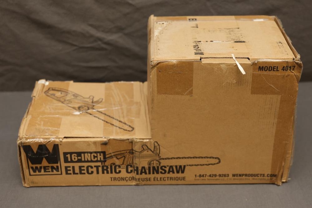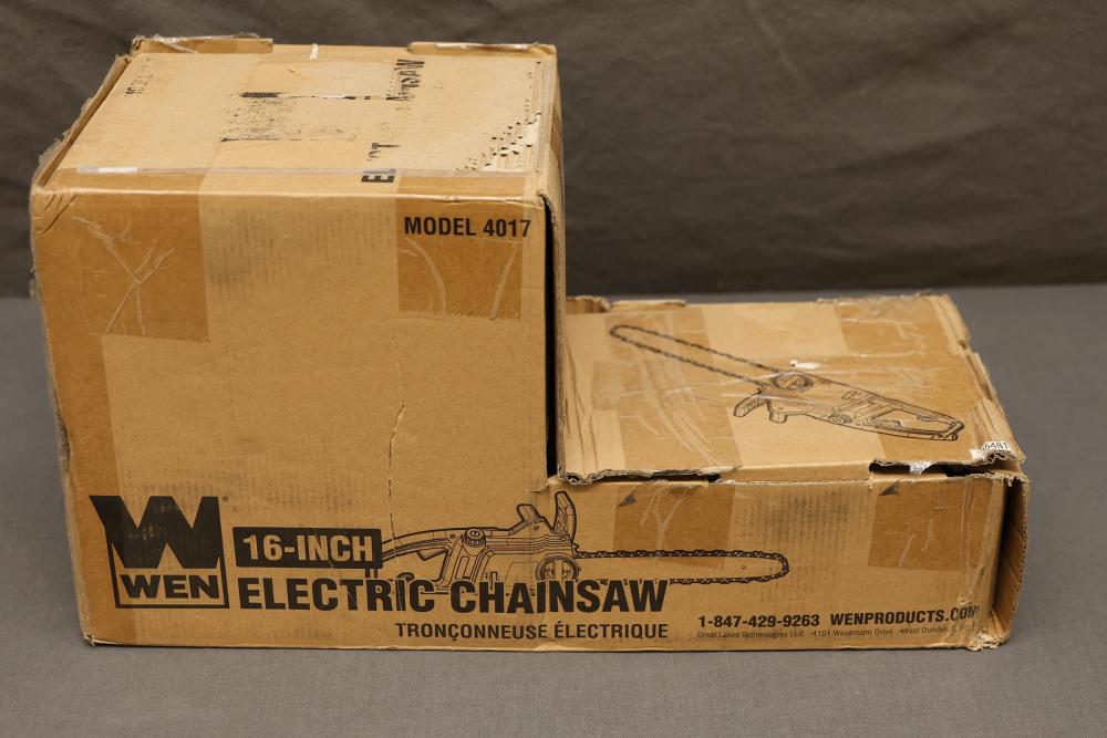WEN 16-inch electric chainsaw, model 4017. Powered by a 120V, 60 Hz, 12A motor, with a 16-inch bar and 44.2 feet per second chain speed. Includes original box, instruction manual, and accessories such as the chain and blade. Ideal for efficient cutting needs. Runs and operates.
