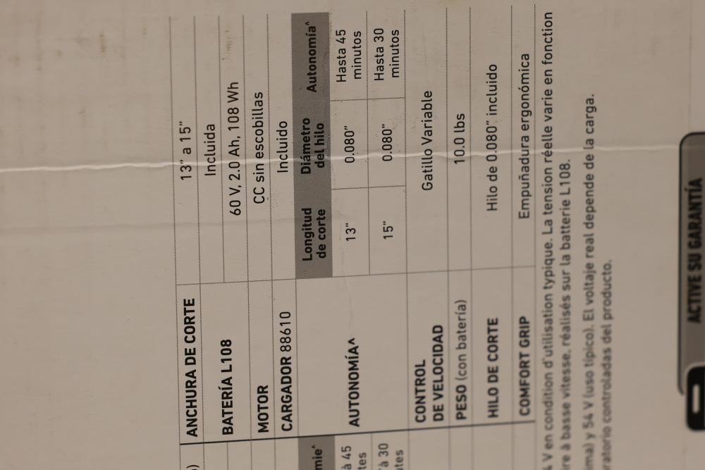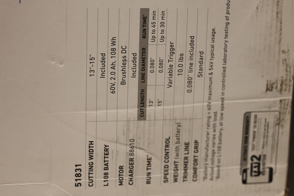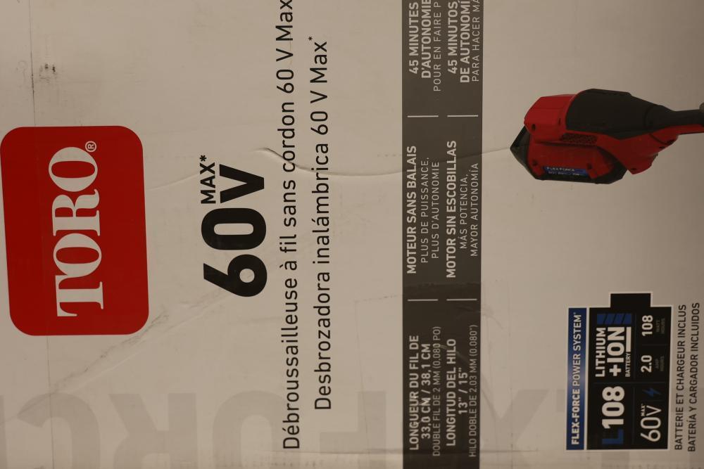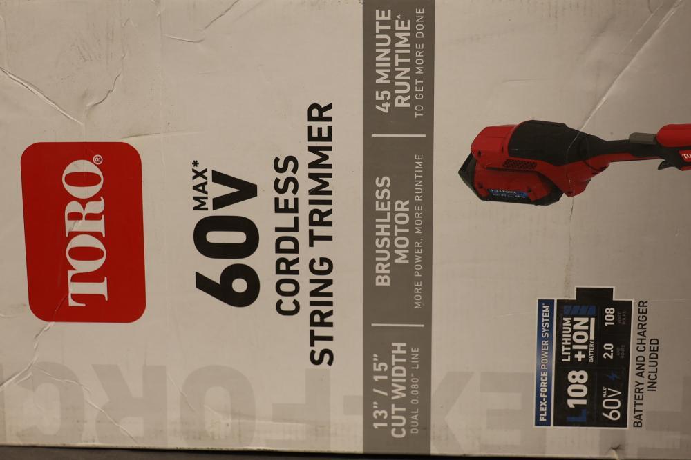 Toro 60V Max cordless string trimmer featuring an adjustable cutting width (13-15 inches), 60V 2.0Ah L108 battery, and brushless DC motor for optimal performance and run time of up to 45 minutes. Includes the 88610 charger required for operation. Features precision control, comfort grip, and compatibility with Toro Flex-Force Power System. Box dimensions are approximately 43 inches in length. New in box.
