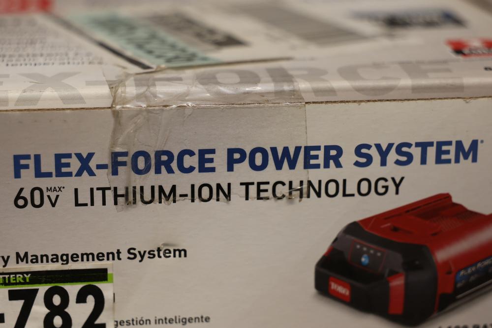 Toro Flex-Force 60V Lithium-Ion Battery System, model 88620, featuring an intelligent battery management system for optimized power output and overload protection. Engineered with a future-proof design to accept next-generation lithium-ion cells and equipped with a temperature-resistant casing made of thermoplastic material for superior performance. Gross weight 1.67 kg. New in box.
