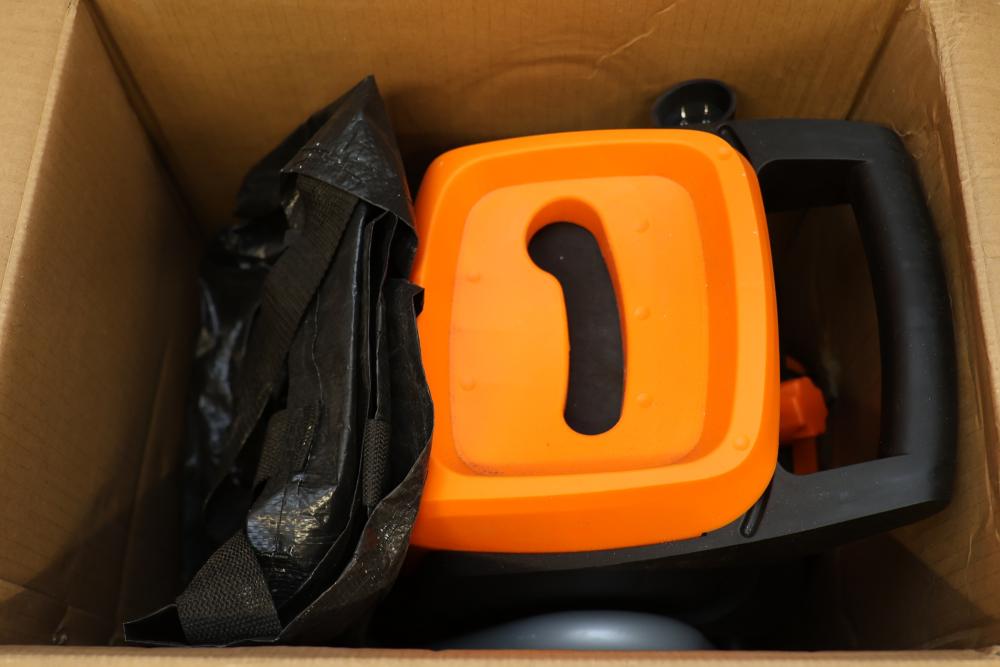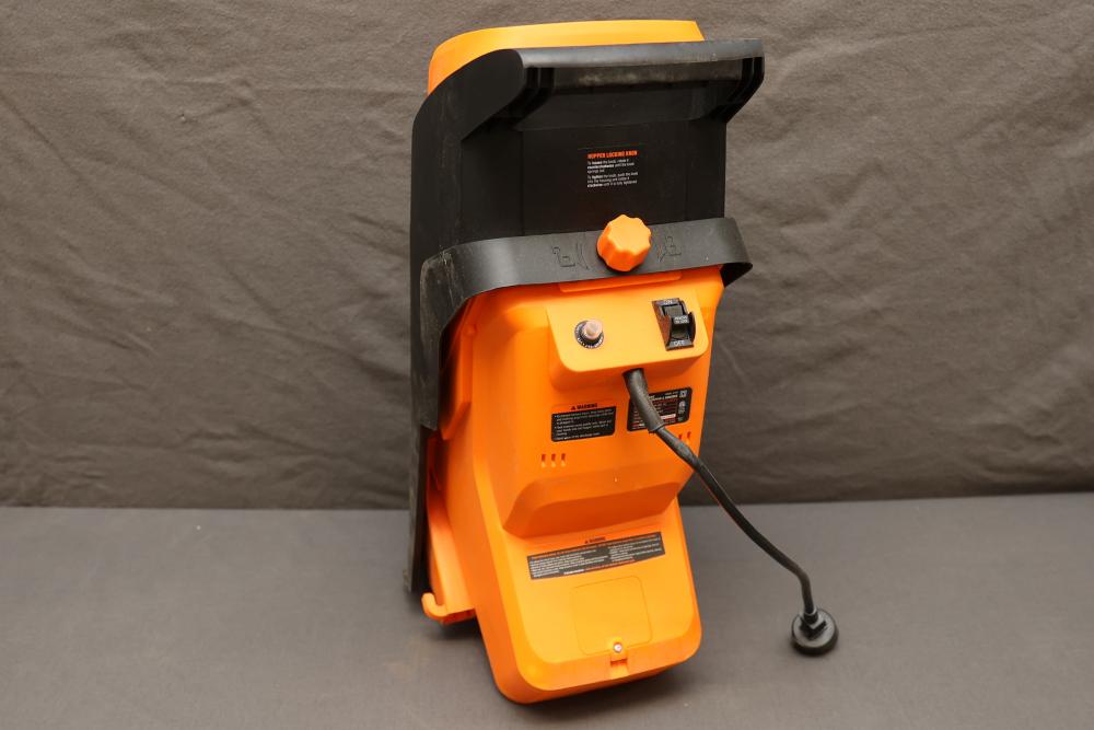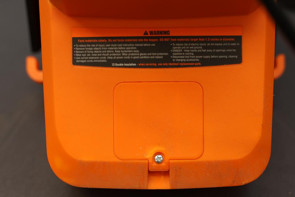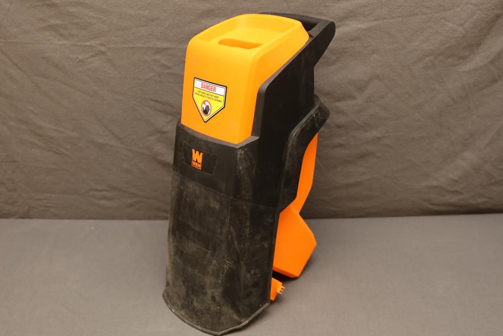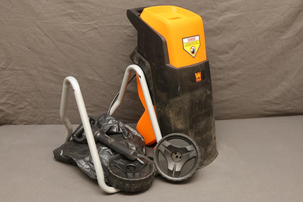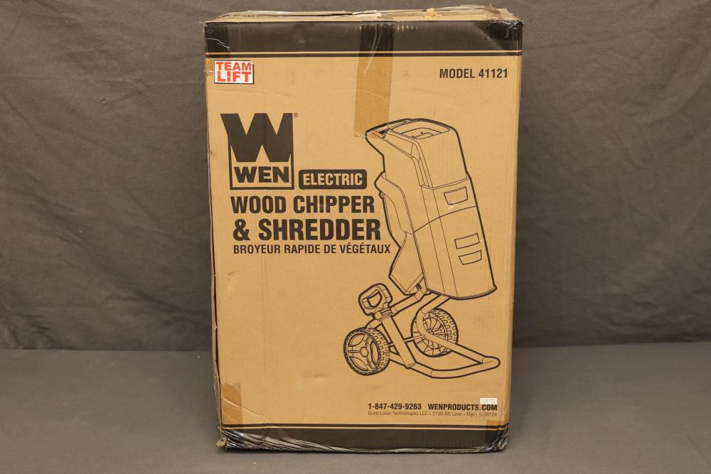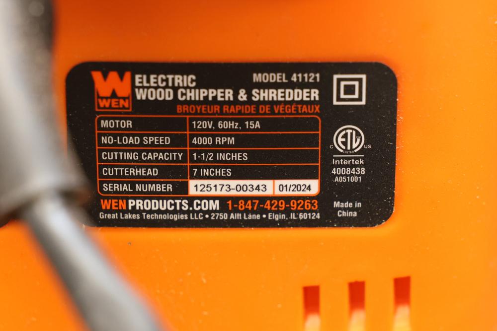 WEN Electric Wood Chipper and Shredder, model 41121, featuring a 120V, 15A motor with a no-load speed of 4000 RPM. It supports a cutting capacity of 1-1/2 inches, and the cutterhead measures 7 inches. Includes original box, partially assembled components, and accessories. Suitable for reducing yard debris efficiently. Made in China. Runs and operates.