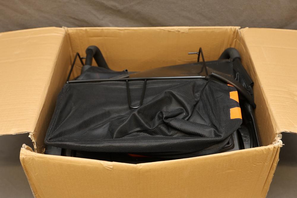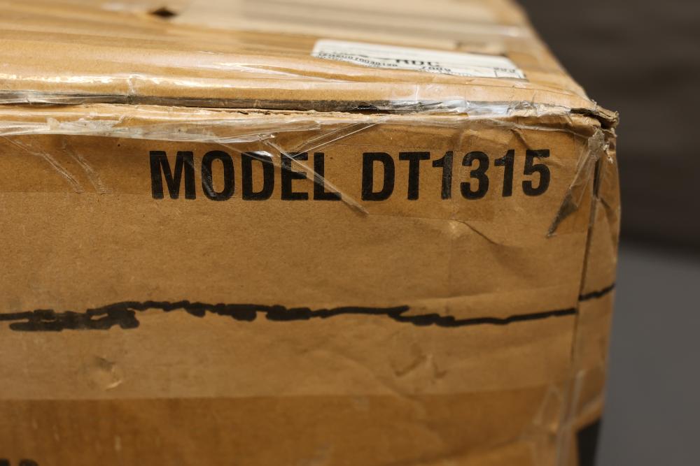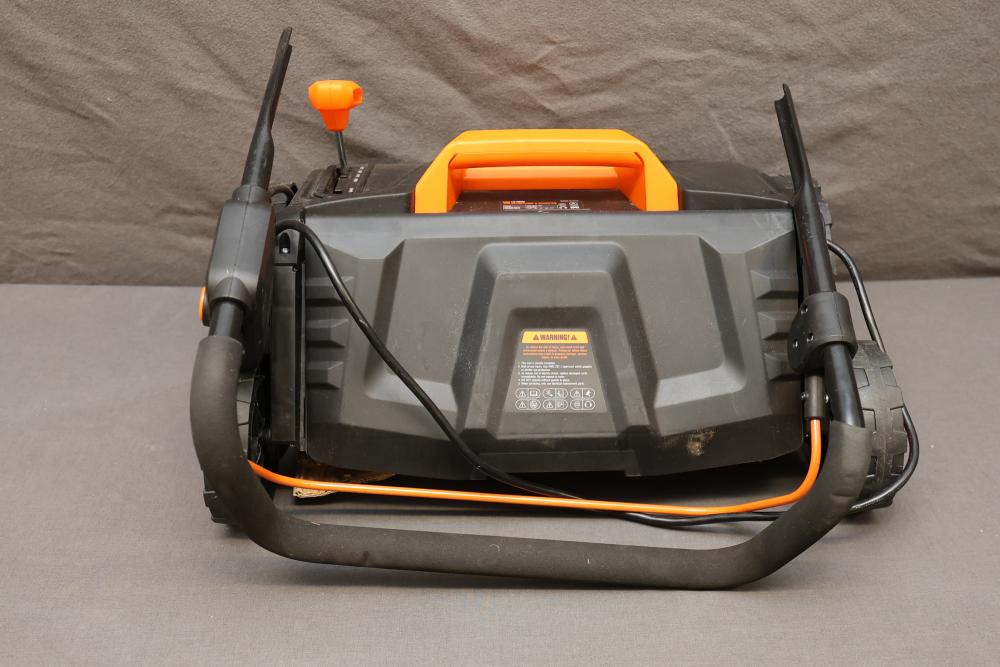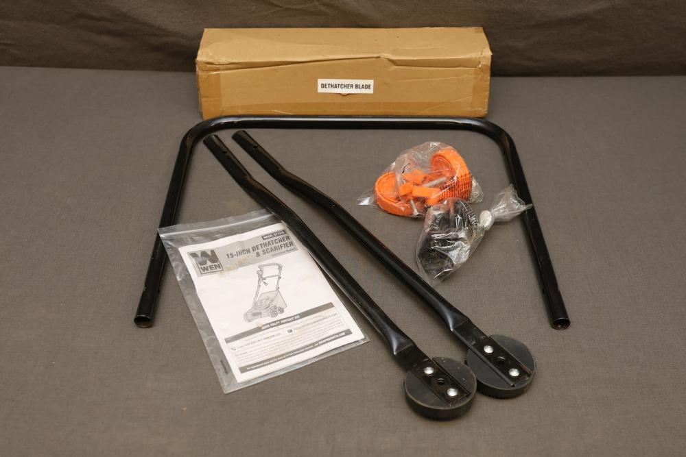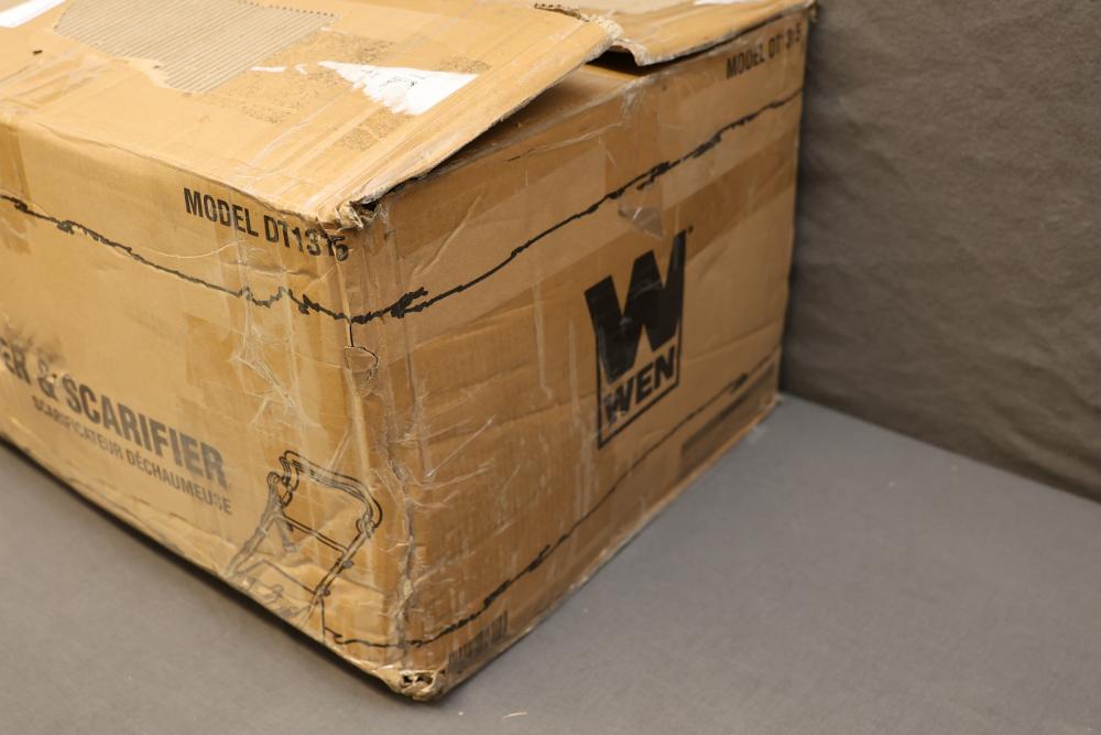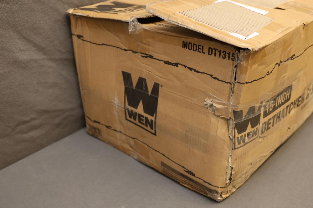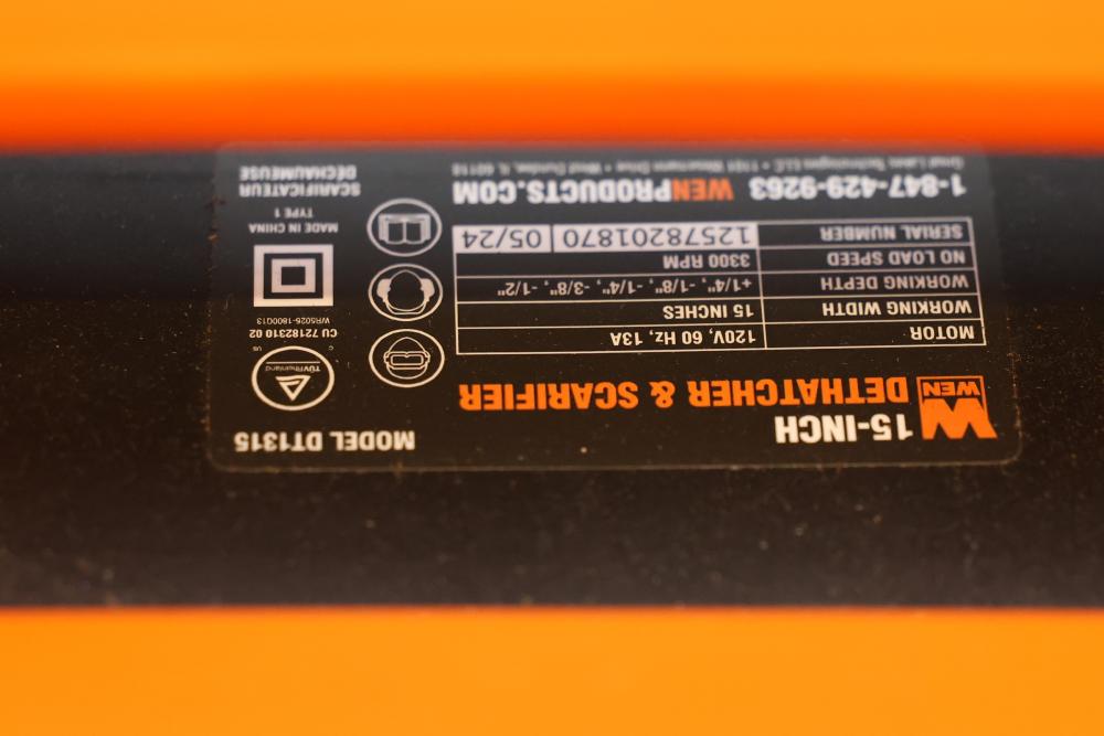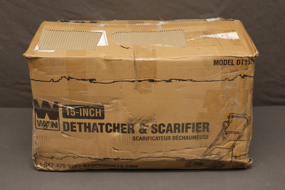 WEN 15-inch dethatcher and scarifier, model DT1315. Includes two handles, orange wheels, assembly parts, and instruction manual. Item is in the original box, which shows signs of wear. Electric motor rated at 13 amps. Designed for robust yard work and efficient dethatching. Runs and operates.