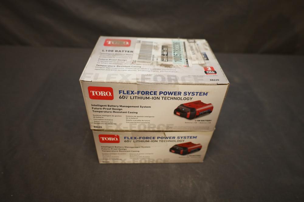 Set of 2 Toro Flex-Force Power System 60V Lithium-Ion Battery Packs. Features intelligent battery management technology for maximum performance and life. Comes with a temperature-resistant casing for enhanced durability. Model number 88620. Includes 3-year full warranty. New in box.