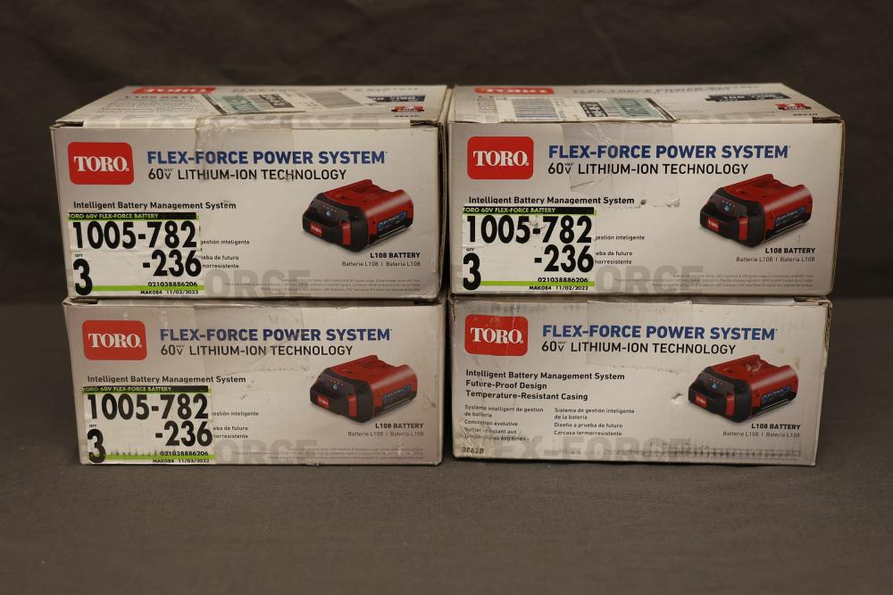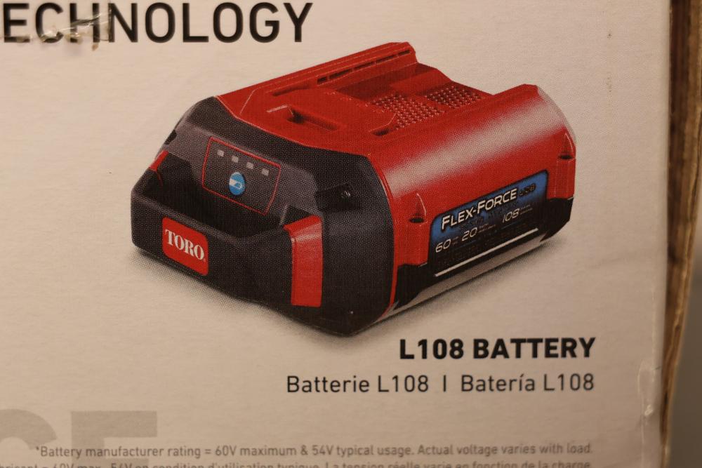 Toro Flex-Force Power System L108 60V Lithium-Ion Battery, model number 88620. Features an Intelligent Battery Management System for optimized power and performance, future-proof design to accommodate next-generation technologies, and a temperature-resistant casing for durability. Gross weight is 1.67 kg. New in box.