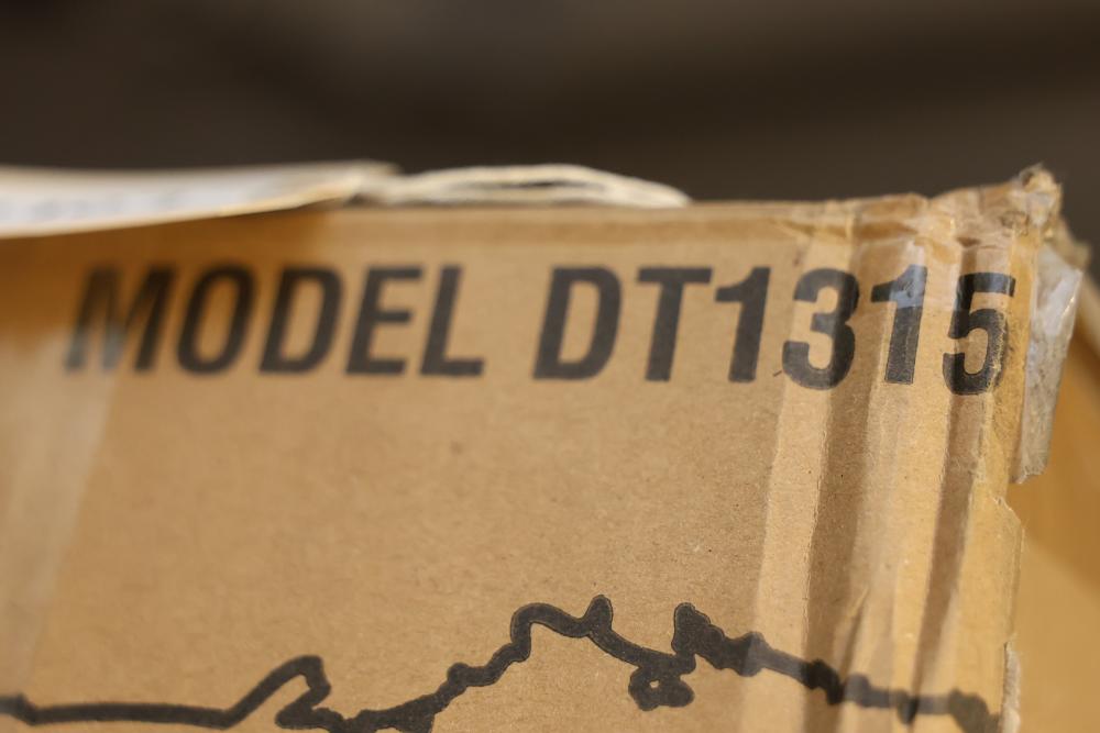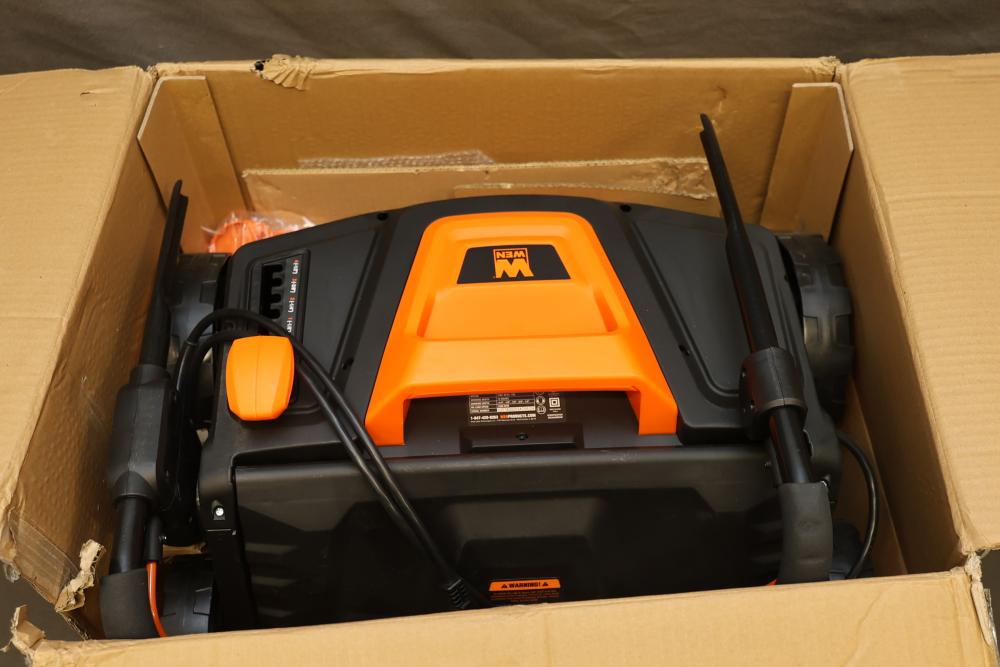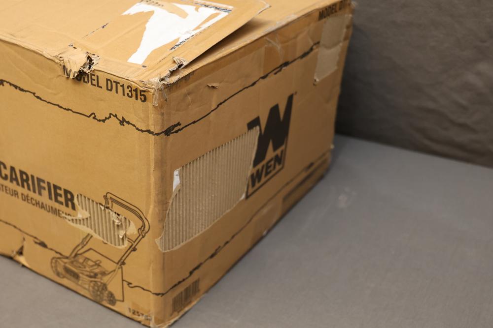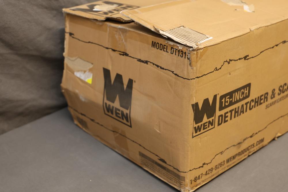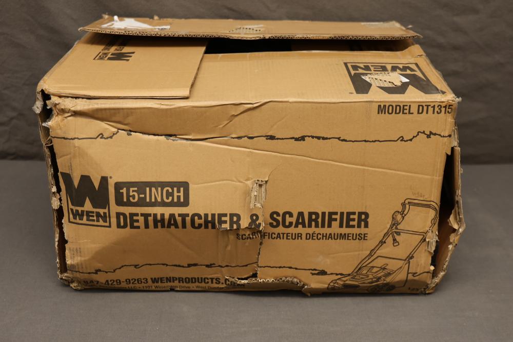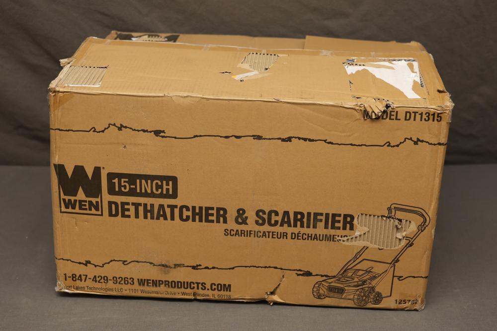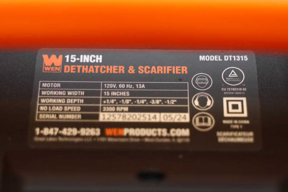 WEN DT1315 15-Inch Dethatcher and Scarifier with a 120V, 60Hz, 13A motor. Features a 15-inch working width, adjustable working depth (-0.39" to 0.24"), and 3300 RPM no-load speed. Includes original box, which shows signs of handling and wear. Serial number: 12578202514. Runs and operates.