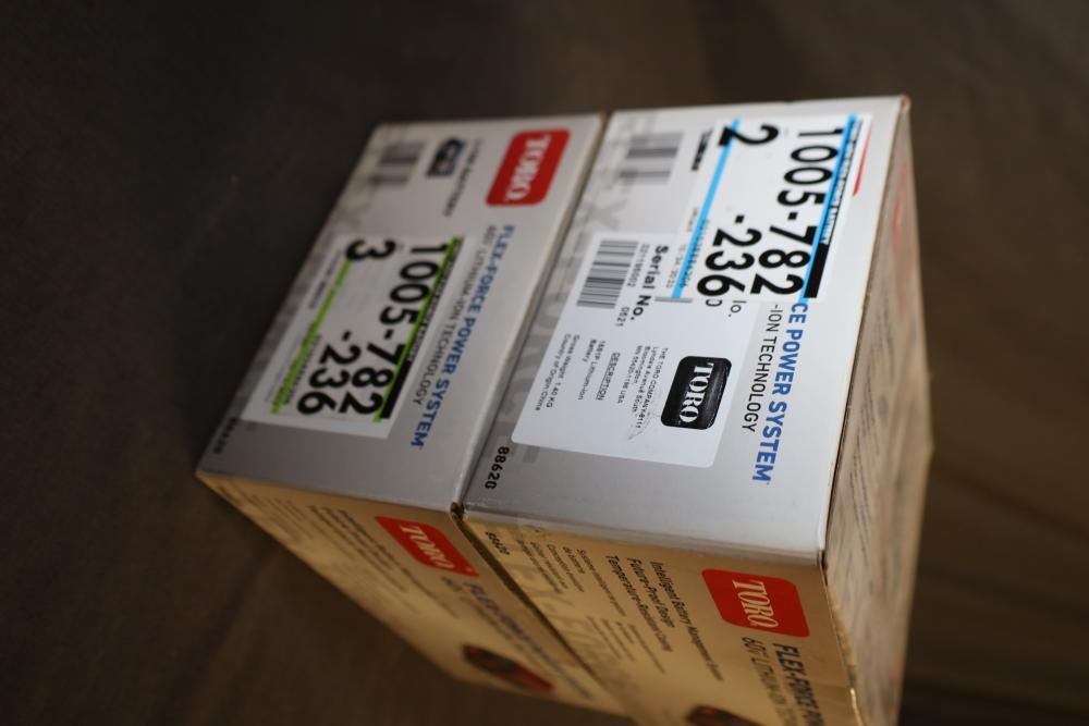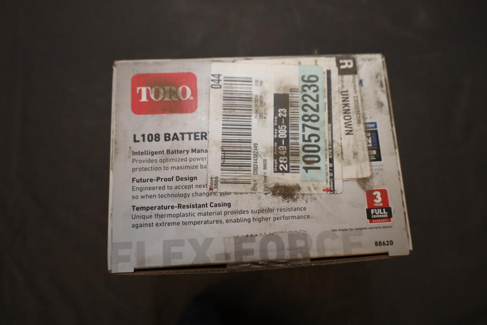 Two Toro L108 batteries featuring 60V Lithium-Ion technology as part of the Flex-Force Power System. Includes intelligent battery management for enhanced performance and durability, a future-proof design, and a temperature-resistant casing for optimal operation in various weather conditions. Packaged as new in original boxes. New in box.