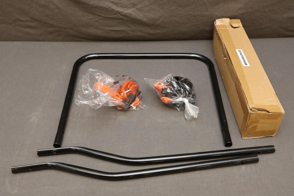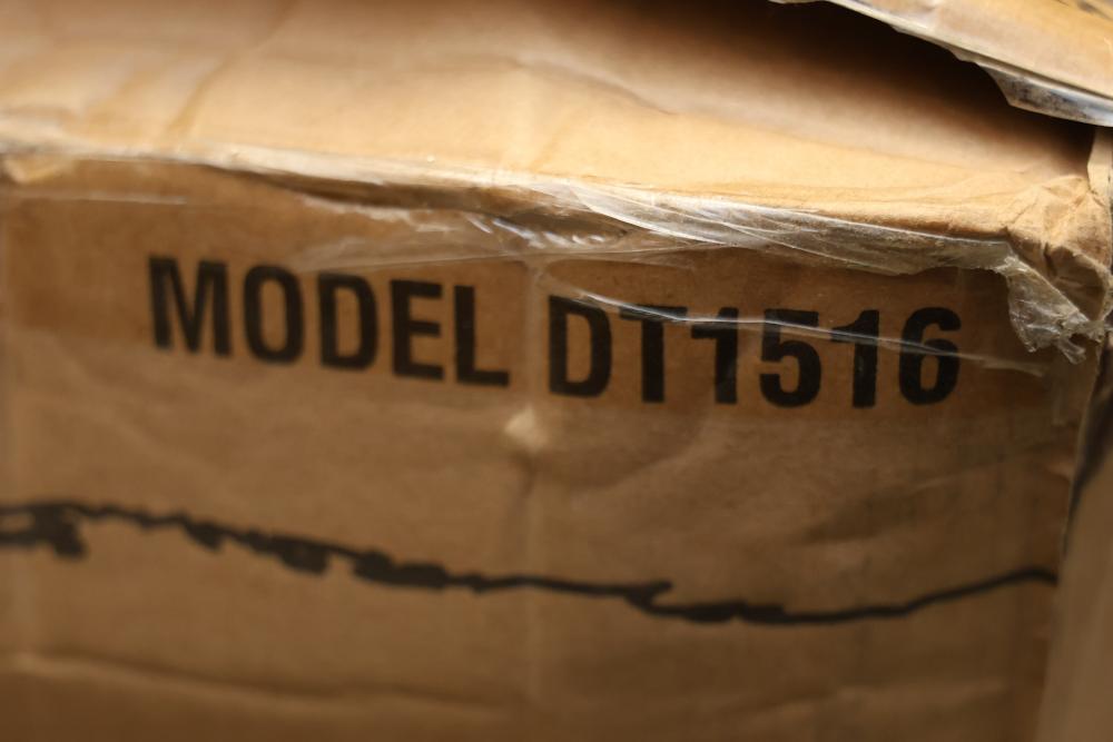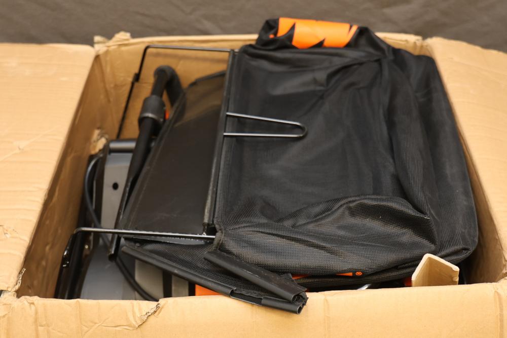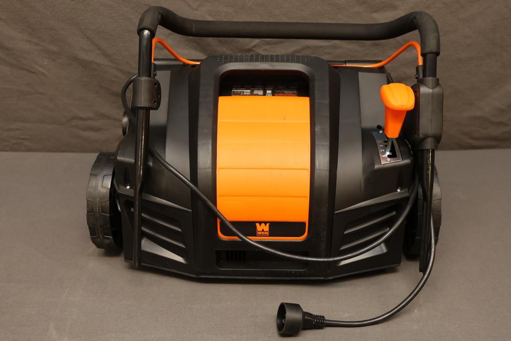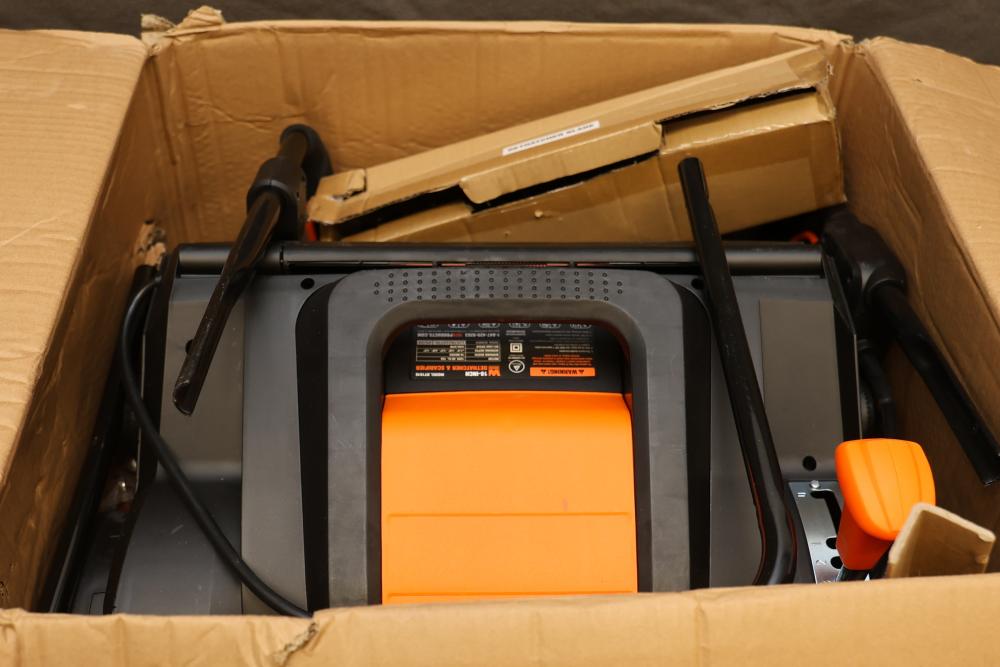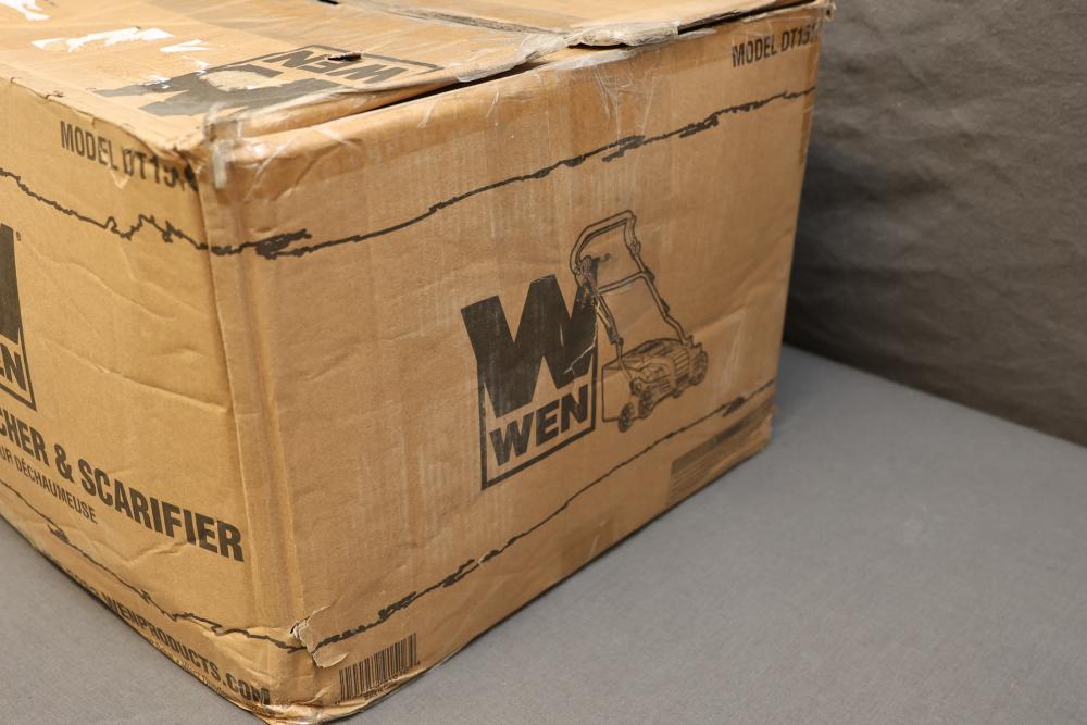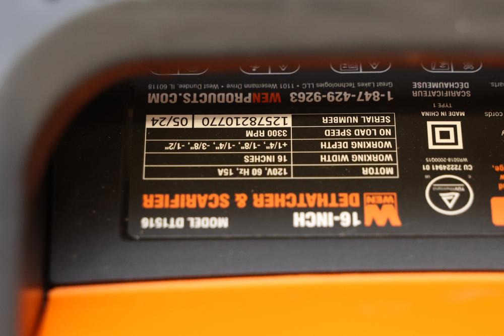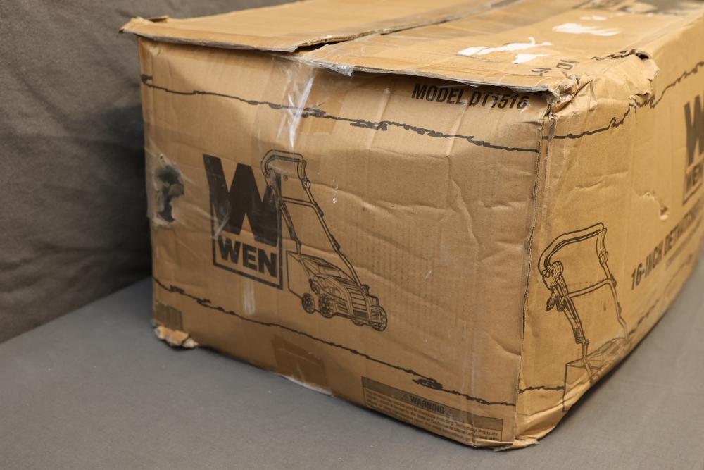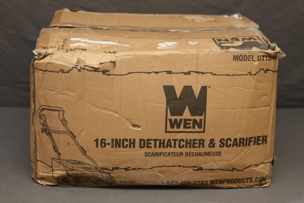 WEN Model DT1516 16-inch dethatcher and scarifier. Designed for dethatching and scarifying lawns with ease, this unit operates at 120V and has a 12-amp motor. Includes handle components and attachments. Item appears to be unused with components in original packaging and the outer box showing some wear and damage from storage. Runs and operates.