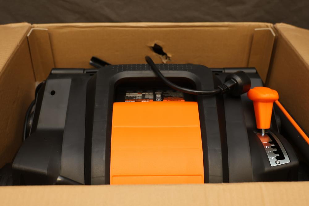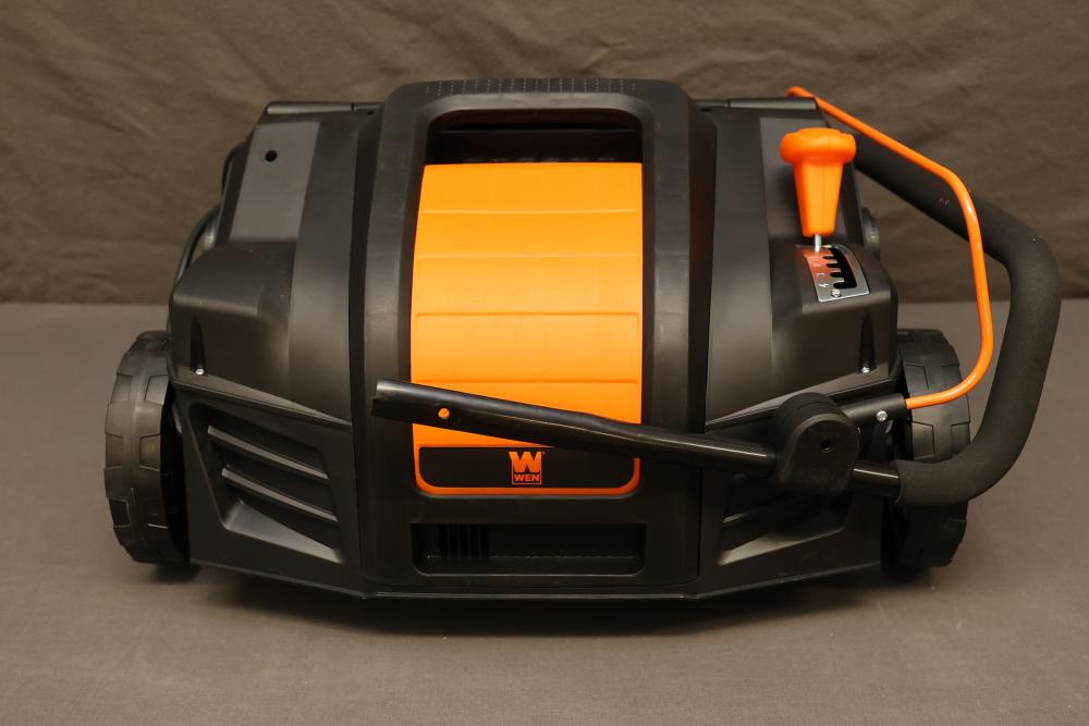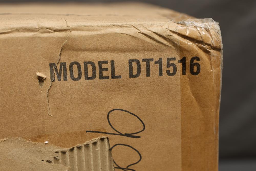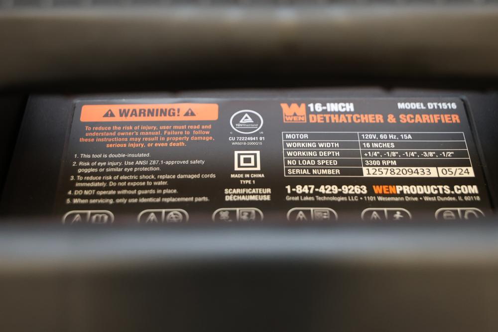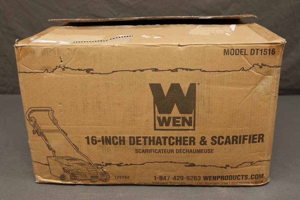 WEN Model DT1516 16-Inch Dethatcher and Scarifier featuring a 120V, 15A motor with a working width of 16 inches. Includes all parts, still in packaging, with original box showing signs of wear. Capable of 3,300 RPM no-load speed. Runs and operates.