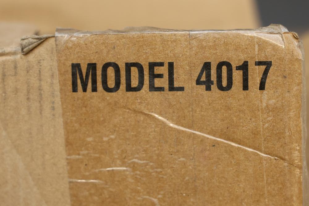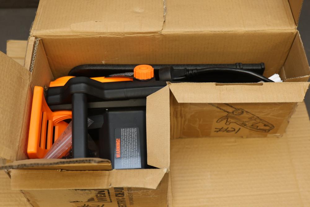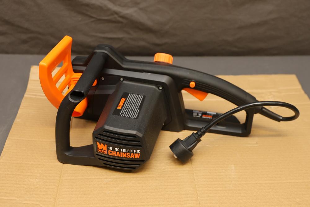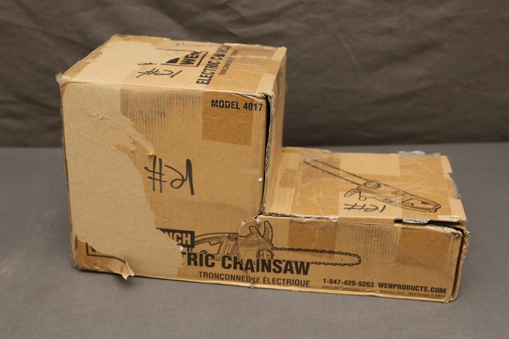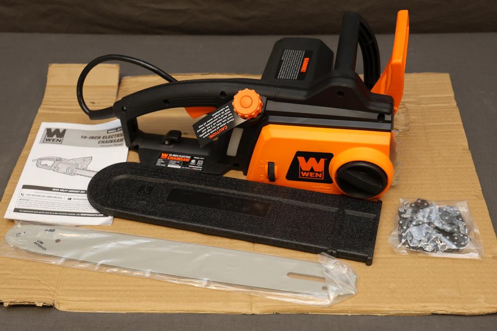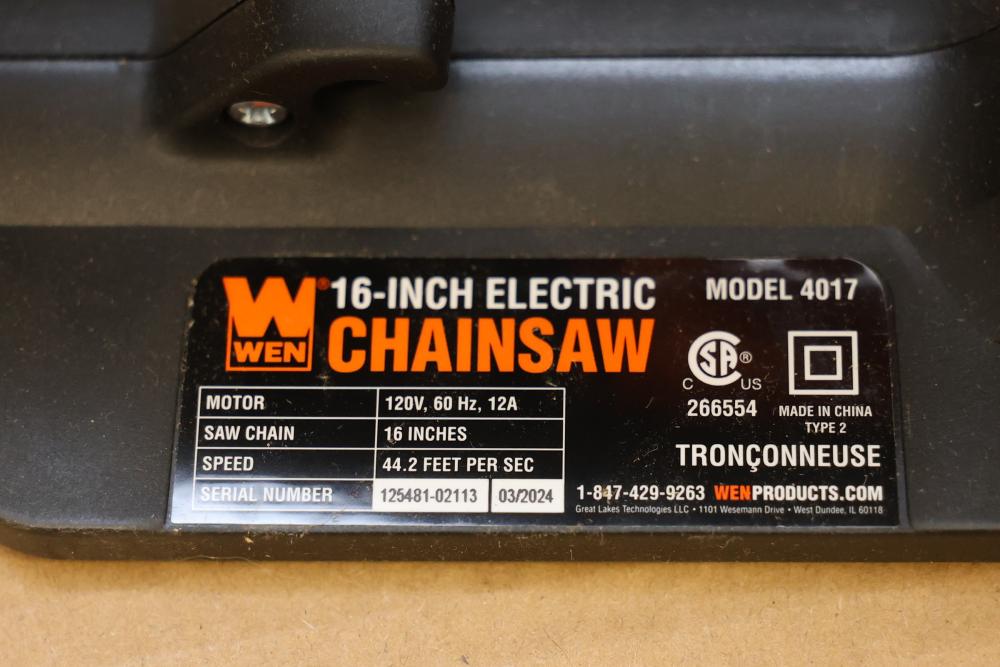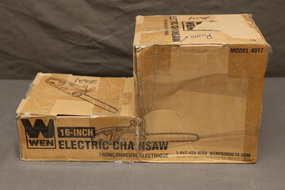 WEN Model 4017 16-inch electric chainsaw with a 120V, 60 Hz, 12A motor. Features a 16-inch bar and chain with a cutting speed of 44.2 feet per second. Includes the chainsaw, bar, chain, instruction manual, and original packaging. Packaging shows signs of wear. Runs and operates.