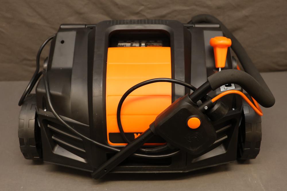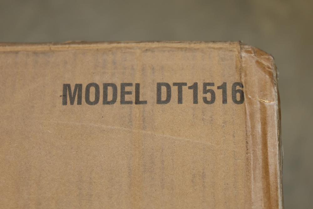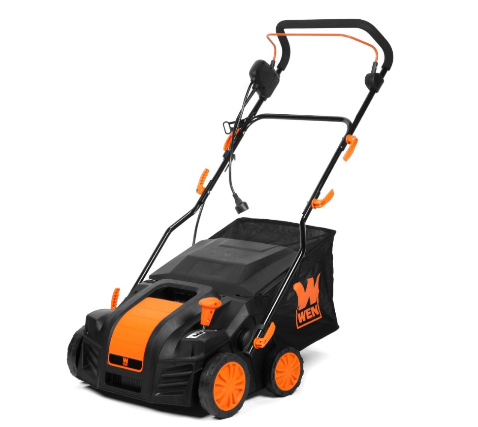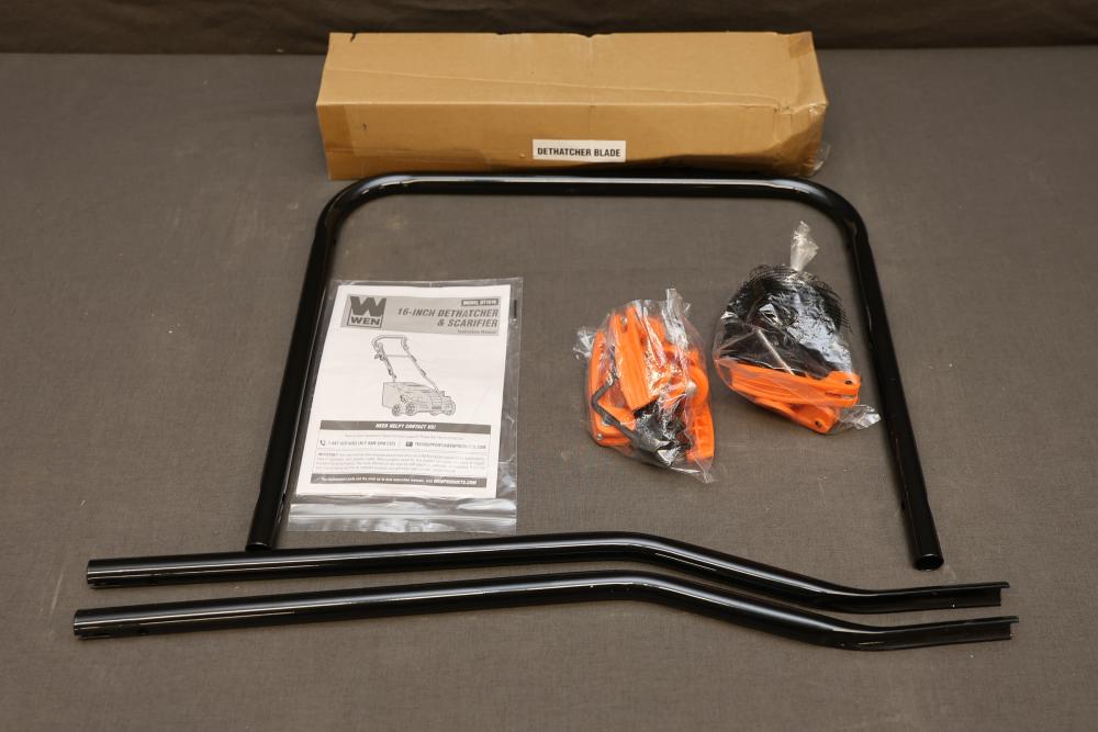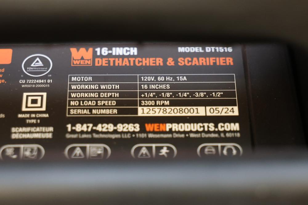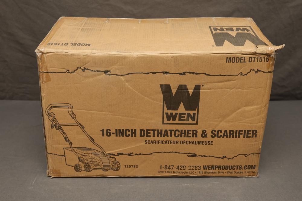 WEN 16-Inch Dethatcher and Scarifier, Model DT1516, with a 120V, 60 Hz, 15A motor. Offers working widths of 16 inches and adjustable working depths of -1/4 inch, -1/8 inch, -3/8 inch, and -1/2 inch. Includes original box, instruction manual, and necessary accessories for assembly. Serial number: 12578208001. Runs and operates.