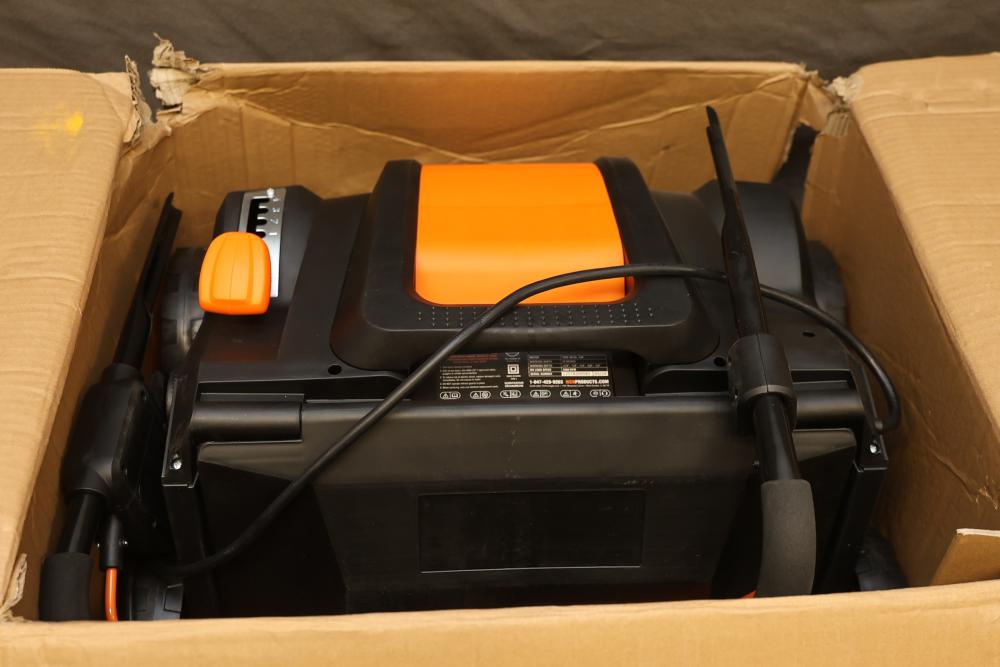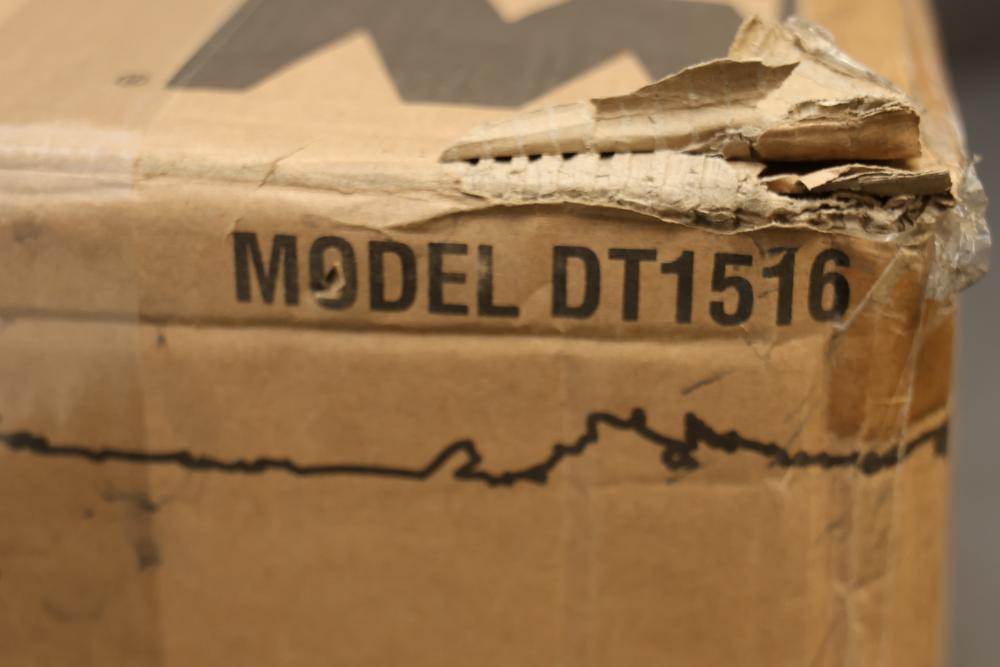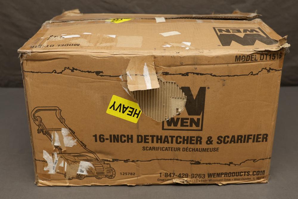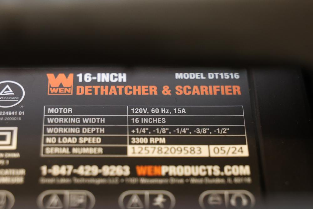 WEN Model DT1516 16-inch dethatcher and scarifier with a motor capacity of 120V, 15A, and a working width of 16 inches. Features adjustable working depths ranging from -1/8" to -1/2", with a no-load speed of 3300 RPM. The item is in its original packaging, though the box shows signs of wear. Runs and operates.