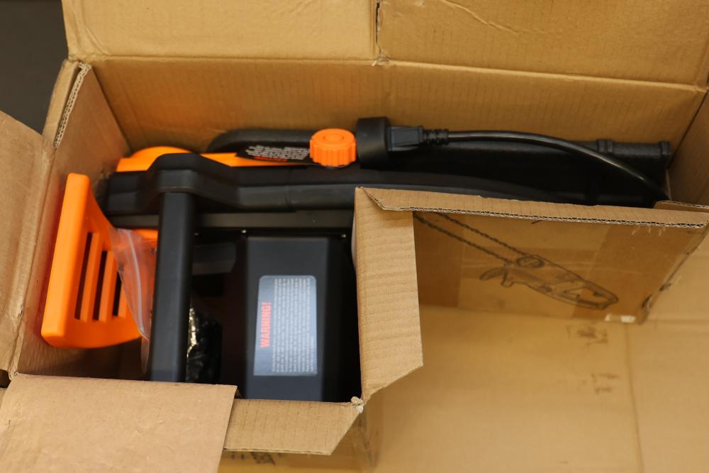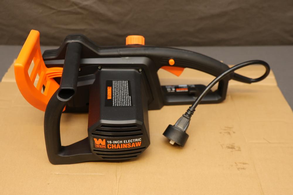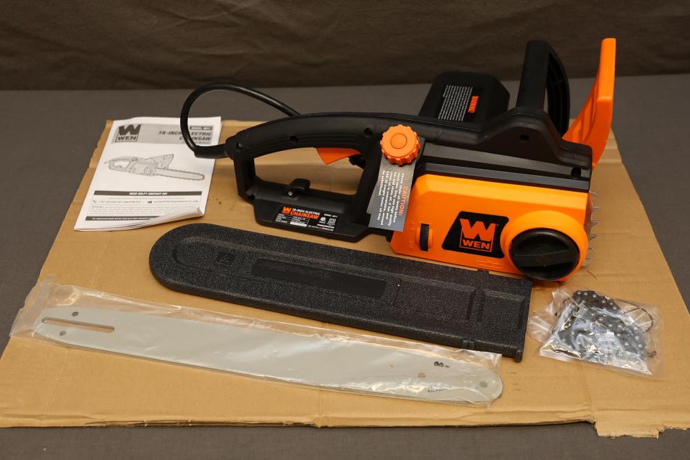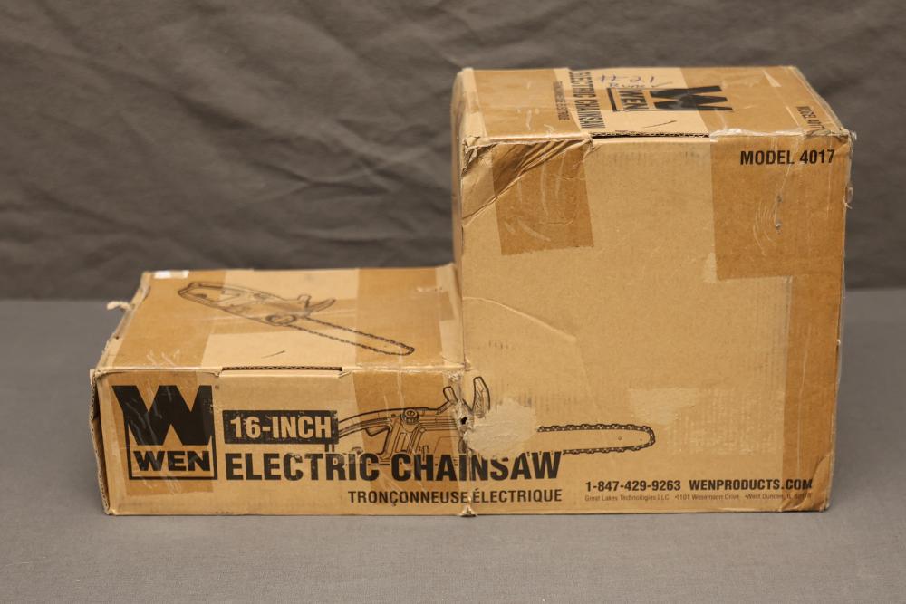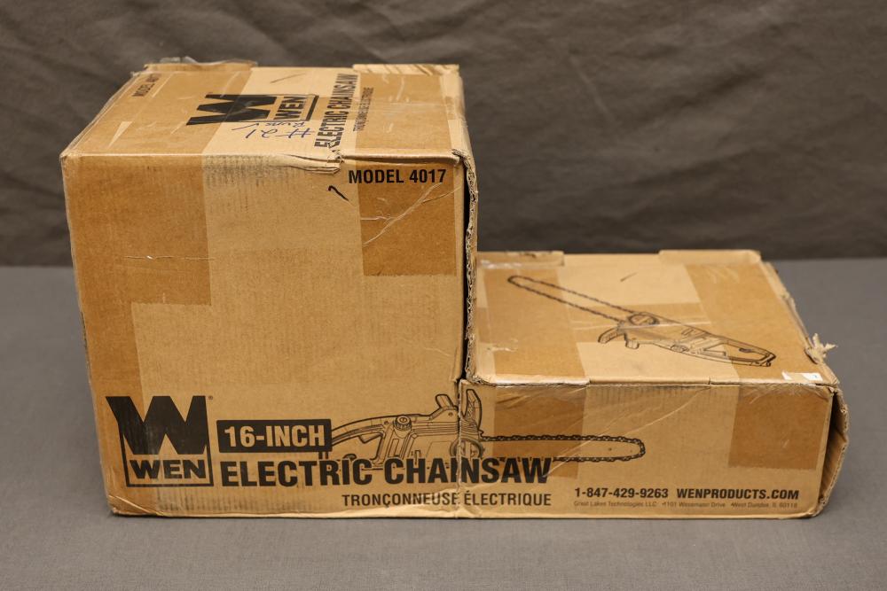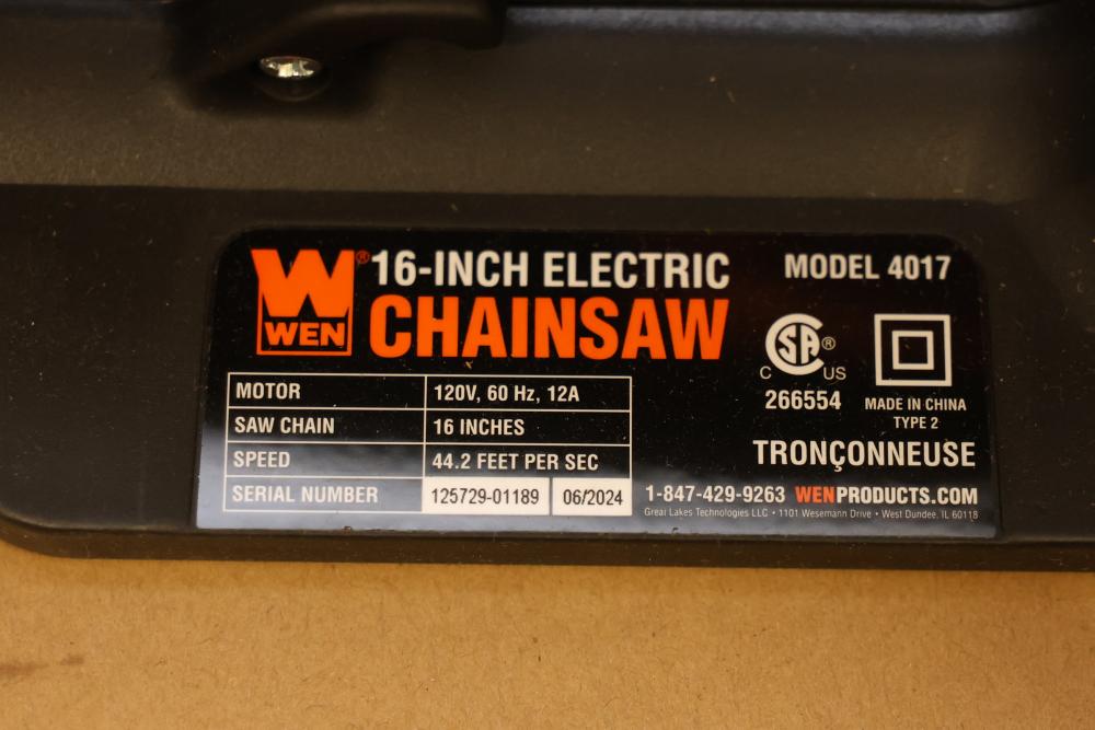 WEN Model 4017 16-inch electric chainsaw features a 120V, 60 Hz, 12 Amp motor, and a 16-inch saw chain. Serial number 125279-01189 with a speed of 44.2 feet per second. The lot includes the chainsaw, chain, scabbard, and manual, all presented in its original packaging. Runs and operates.