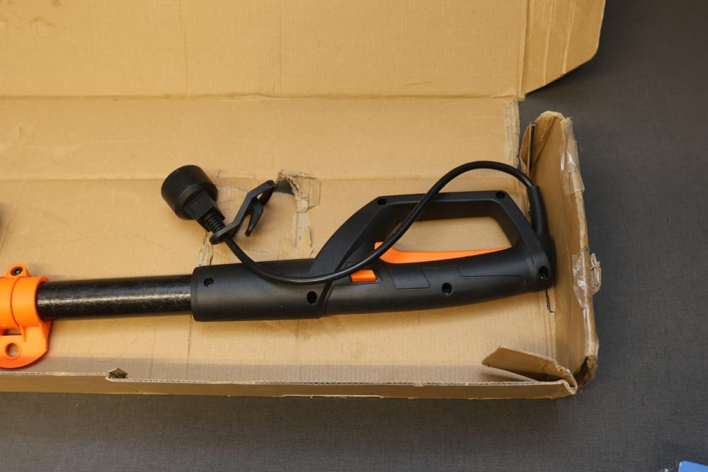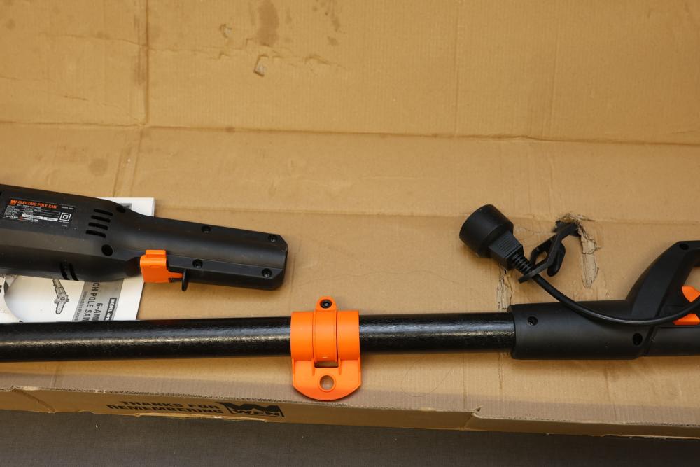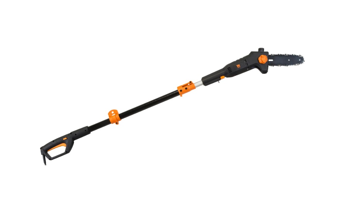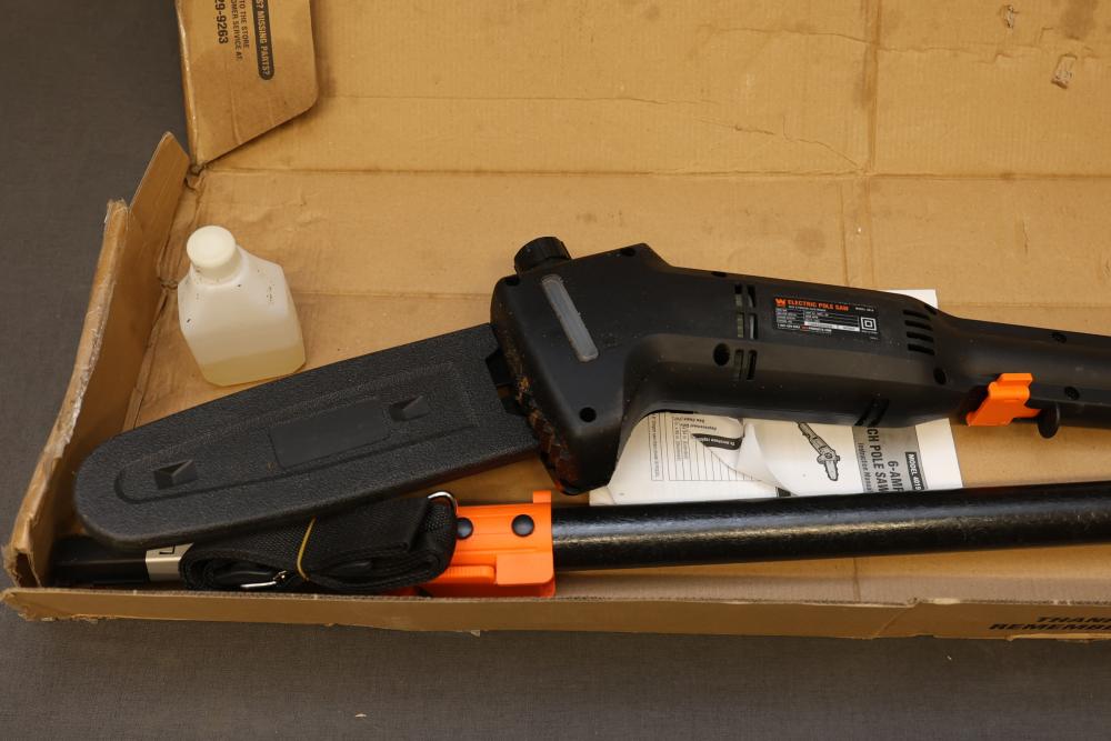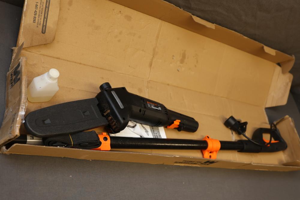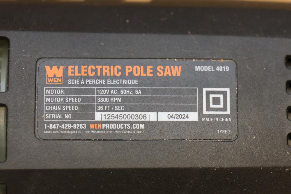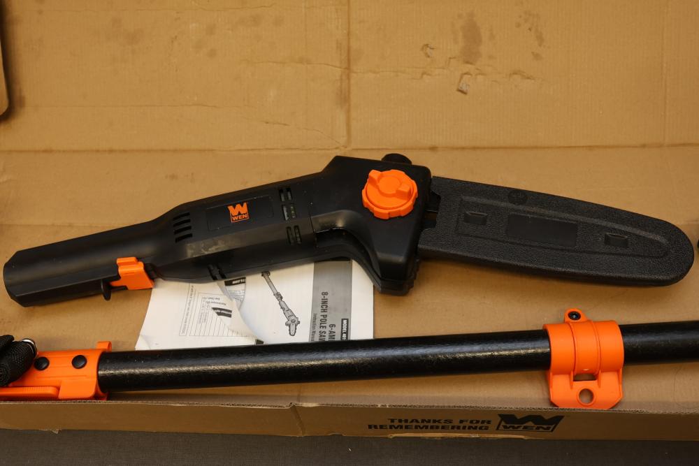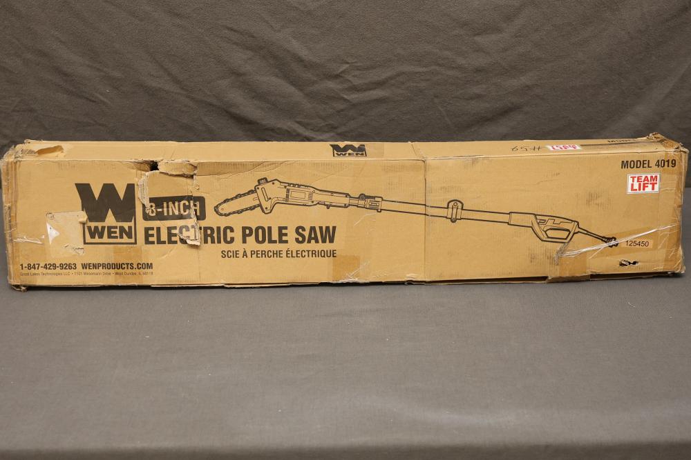 WEN 8-Inch Electric Pole Saw, Model 4019, featuring a 120V AC, 60Hz, 6A motor with a chain speed of 36 feet per second and 3800 RPM. Includes components as shown, with the original packaging present, though it has visible wear. Offers an extendable reach for efficient trimming. Runs and operates.