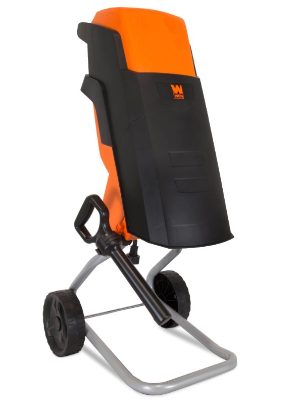 WEN Model 41130 portable electric wood chipper and shredder with collection bin. Features a compact design with a handle and wheels for portability. Includes a durable plastic collection bin for debris. Housed in its original packaging, with some wear present to the box. Runs and operates.