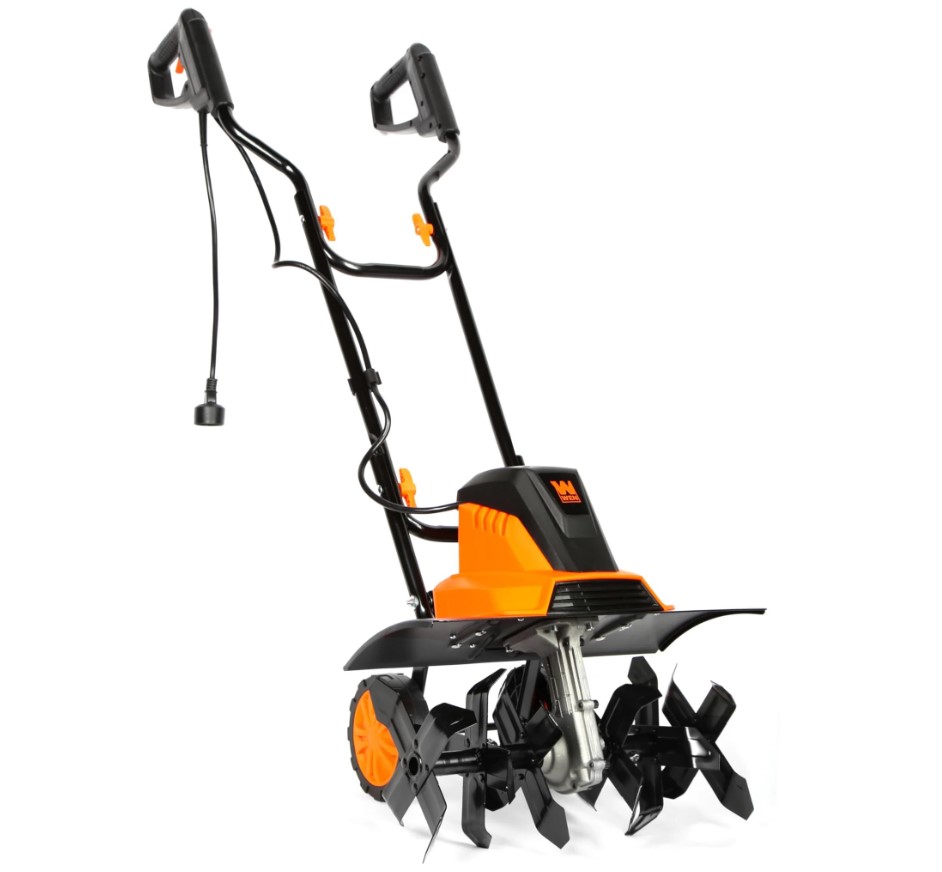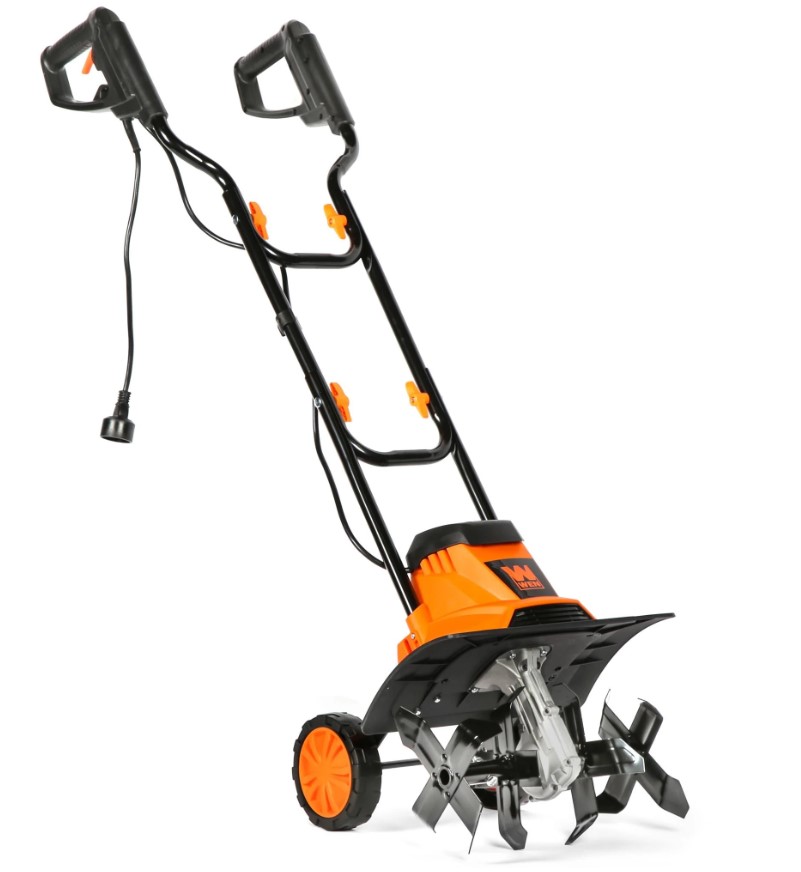 WEN Model TC1318 18-inch electric tiller with dual-handle design and adjustable grips. The tiller includes heavy-duty steel tines for efficient tilling and a durable electric motor. Packaged in its original box, though the box shows signs of wear and tear. Runs and operates.