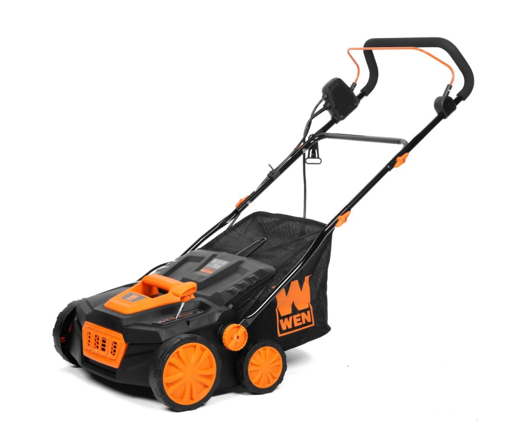 WEN Model DT1315 15-Inch Dethatcher and Scarifier. Features a 3800 RPM motor and a 15-inch width for dethatching and scarifying lawns. Includes accessories such as handlebars, user manual, and extra blade. Item is packaged in the original box, which shows signs of wear. Runs and operates.