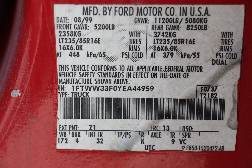 2000 Ford F-350 Super Duty truck, 7.3L V8 diesel engine, VIN: 1FTWW33F0YEA44959, odometer reading: 162,617 miles. Runs and drives. Title & Bill of sale available. Excludes all contents. Truck is still in use and mileage will vary at time of pickup.