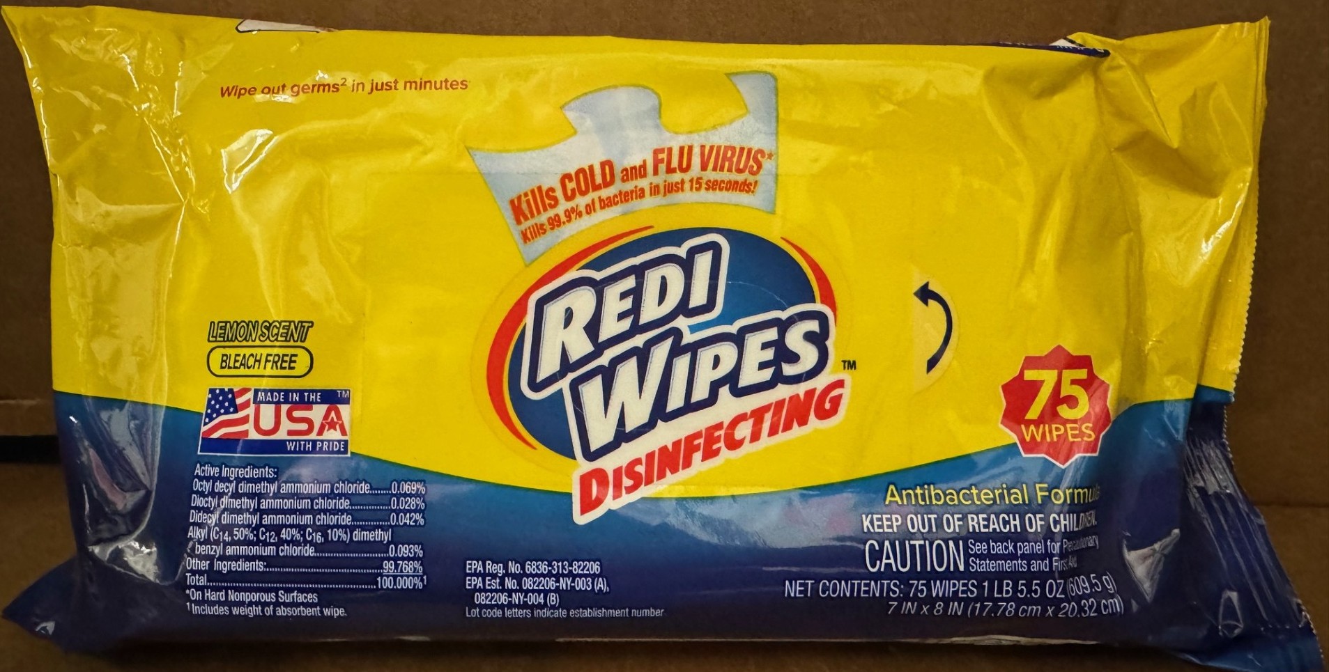 2 Packages Redi-Wipes Lemon-Scent Disinfecting Wipes - 75 Wipes per Package / 150 Total Wipes.