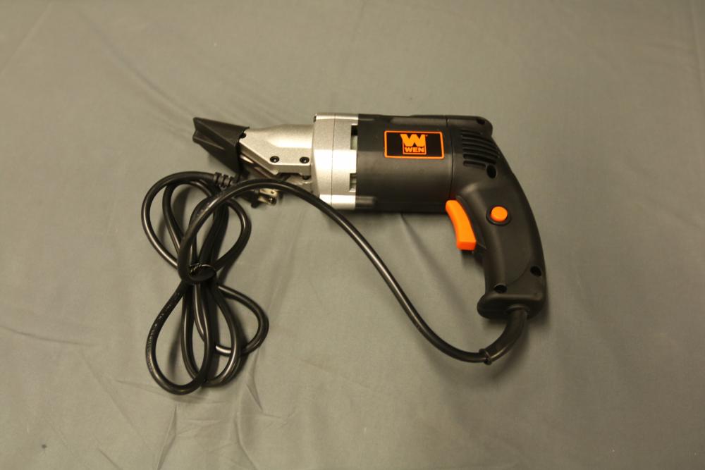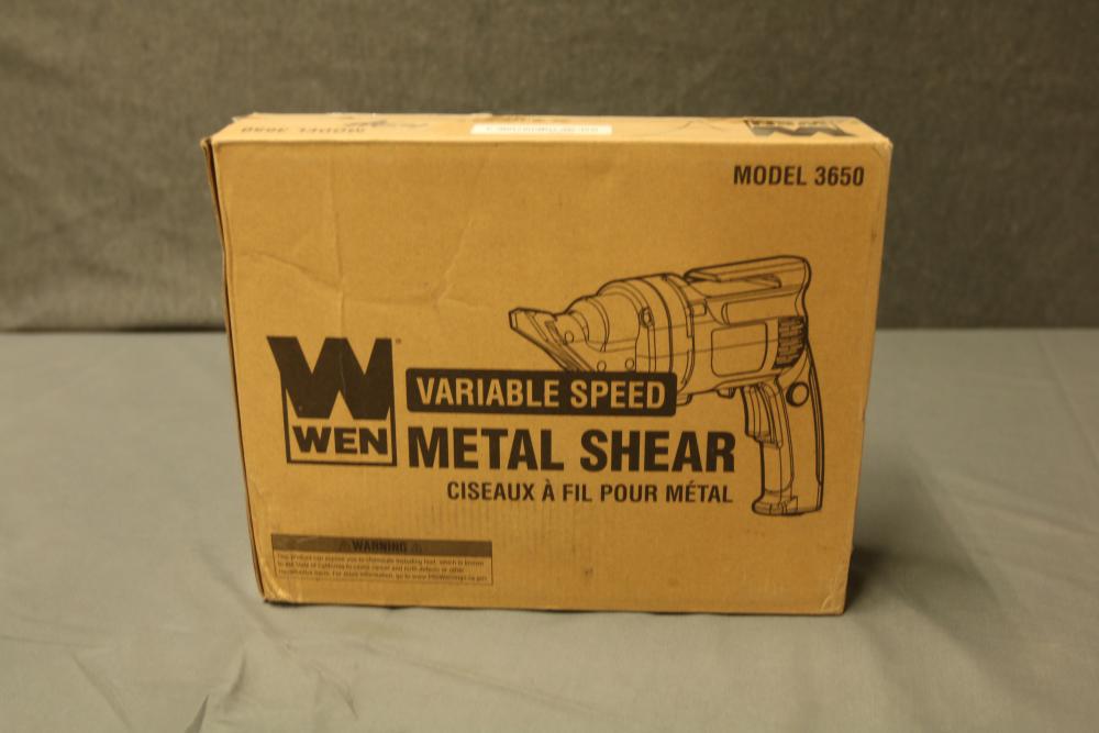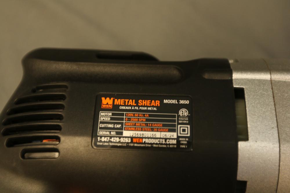 WEN Model 3650 Variable Speed Metal Shear designed for cutting through sheet metal. Features a 120V, 4.0A motor with a cutting capacity of up to 20-gauge mild steel and 22-gauge stainless steel. Includes original packaging and documentation. Opened product. Appearing to be complete. Runs and operates.