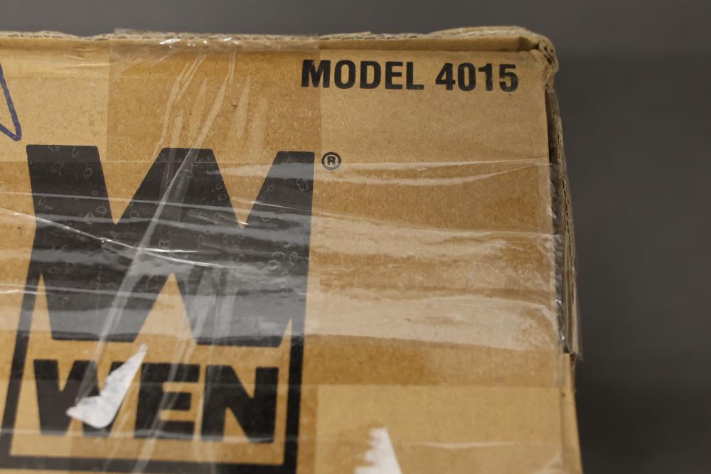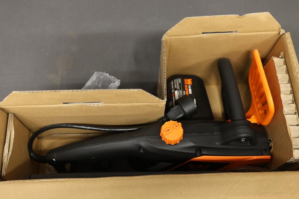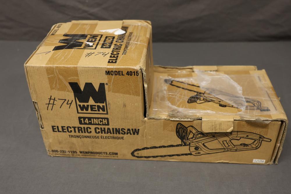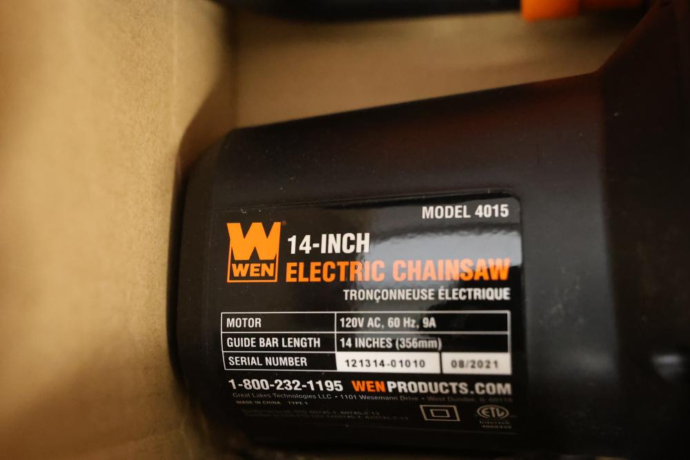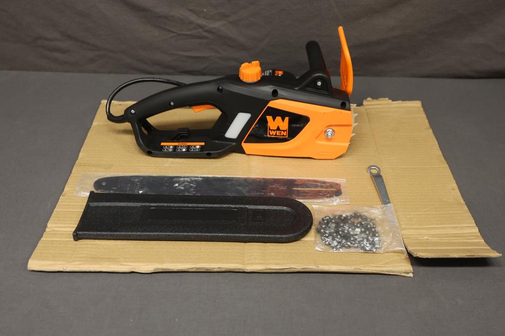 WEN Model 4015 14-inch electric chainsaw with a 9 Amp motor. Includes guide bar, chain, sheath, wrench, and original packaging. Item appears unused and includes its original components. Opened product. Appearing to be complete. Runs and operates.